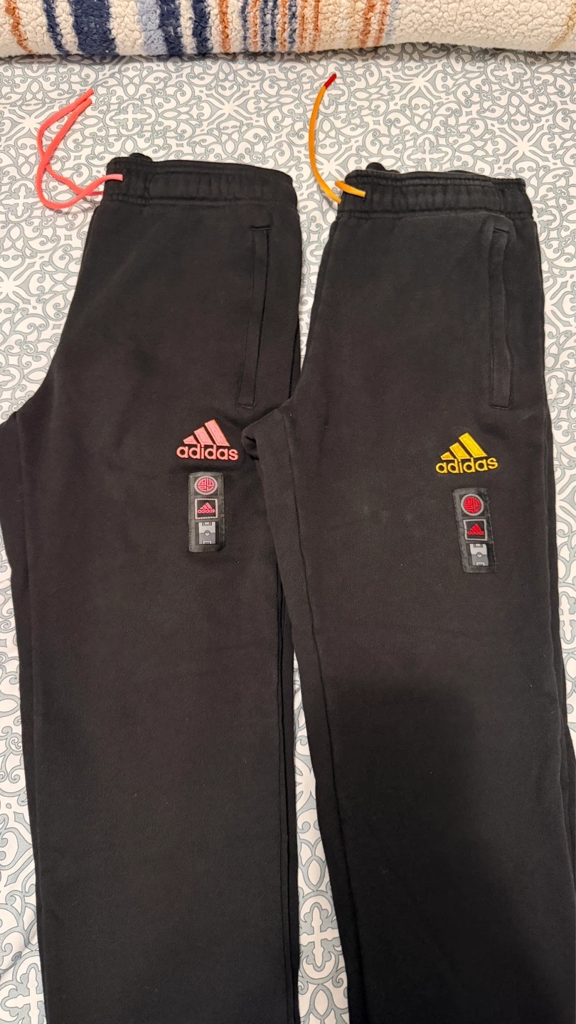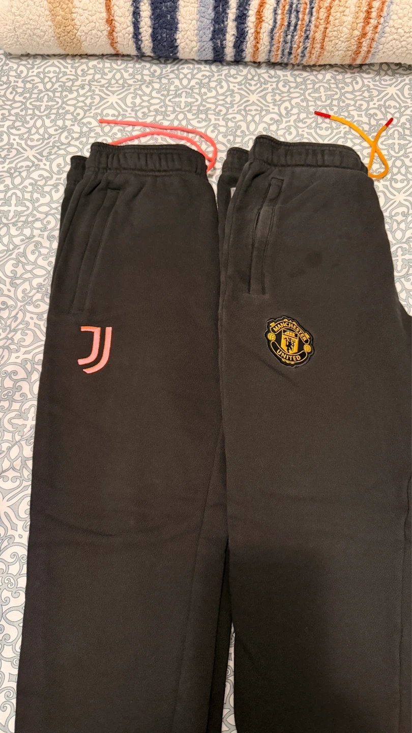 This is a bundle of two pairs of black track pants. One pair features the Juventus logo in pink, and the other features the Manchester United logo in gold. Both pairs have the Adidas logo and soccer-themed detailing on the leg. They're made of a soft, comfortable material.