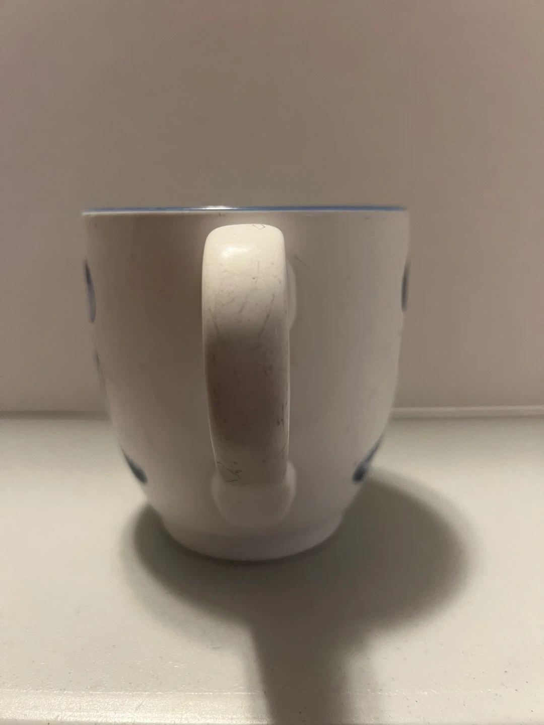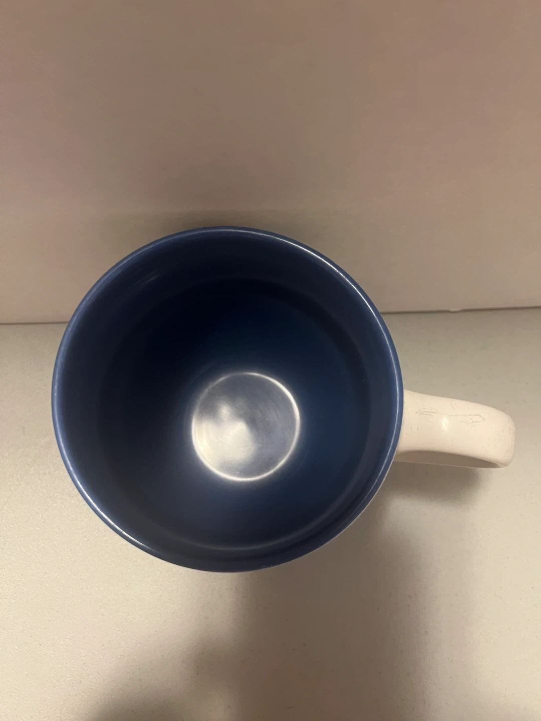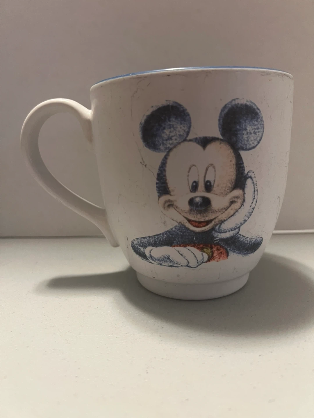 •Color: White on the outside, with a silhouette of Mickey Mouse on both sides of the mug, and blue on the inside of the mug.