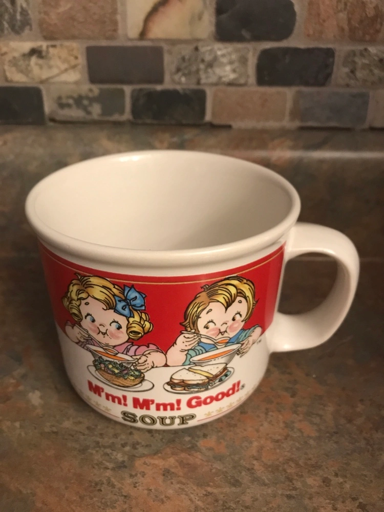 A vintage Campbell's Soup mug with the classic "Mm! Mm! Good!" slogan. The mug features a picture of two children enjoying a bowl of Campbell's soup.