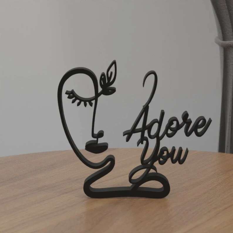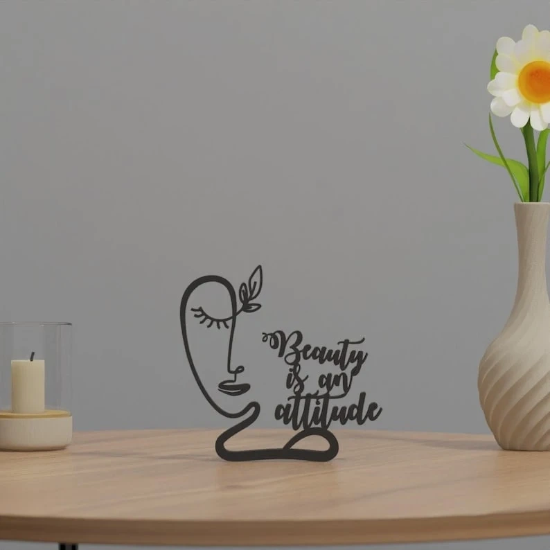 This black line art desk decor features a minimalist face design. It comes in two styles: 'Beauty is an attitude' and 'Adore You'. A nice addition to any tabletop!