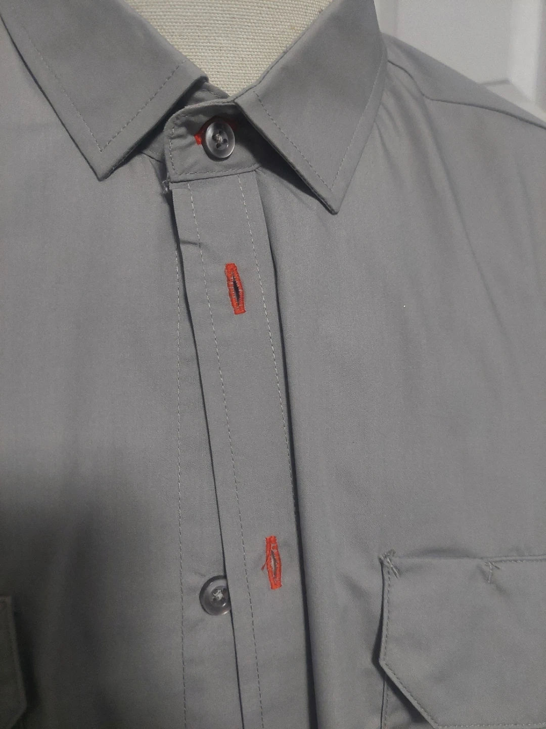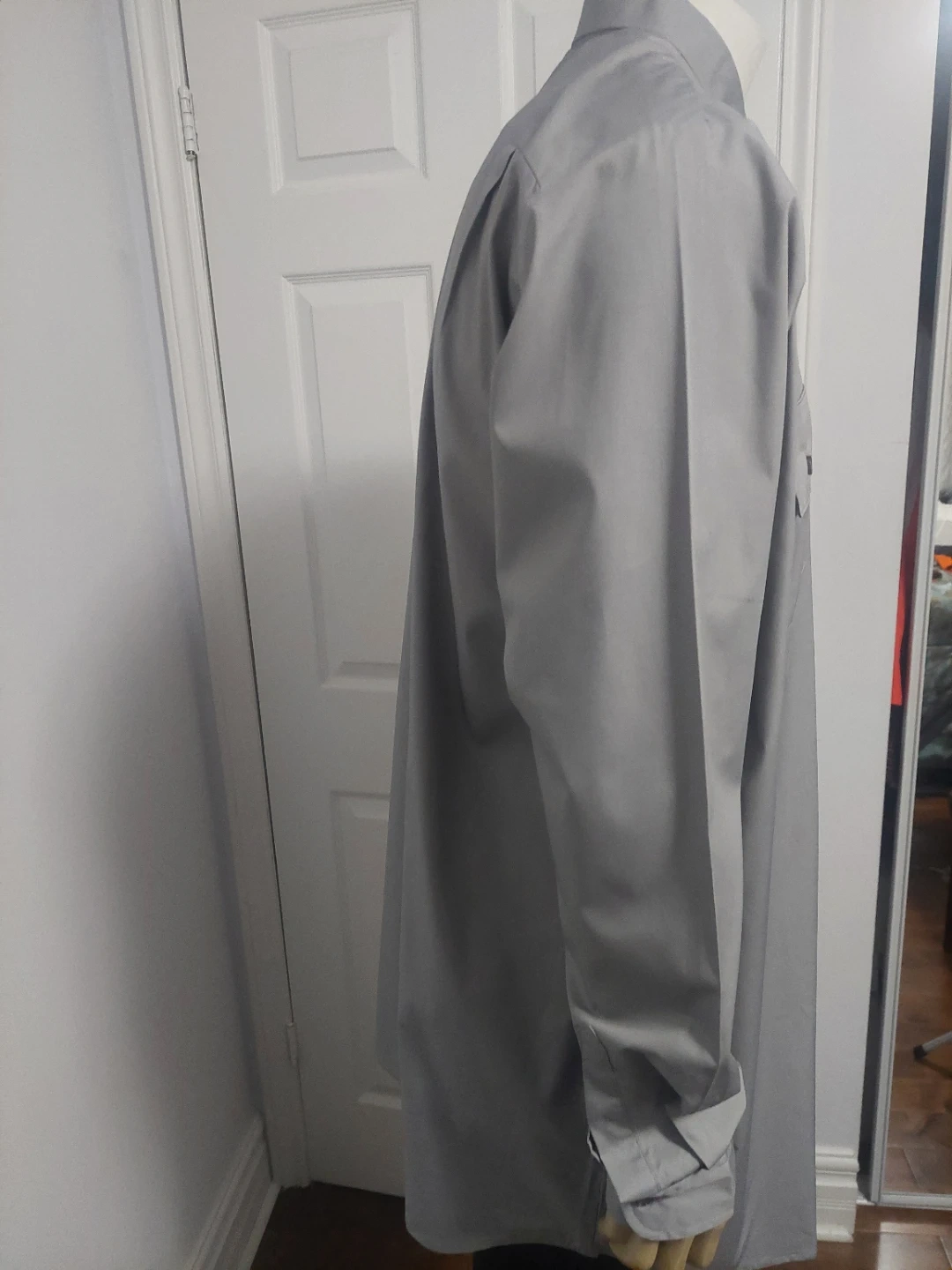 This is a grey long-sleeve shirt for Tall men over 6 feet. It's made of 65% polyester and 35% cotton. It has two chest pockets. It's a size L/G.