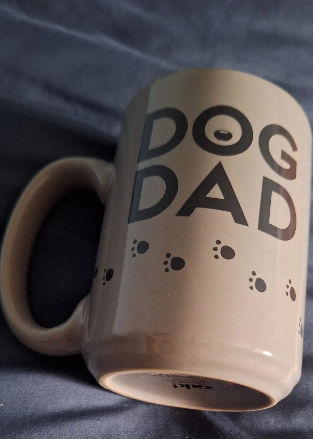 This mug has a fun 'Dog Dad' design with paw prints. It's a great way to show off your love for your furry friends! Holds a good amount of your favourite beverage.