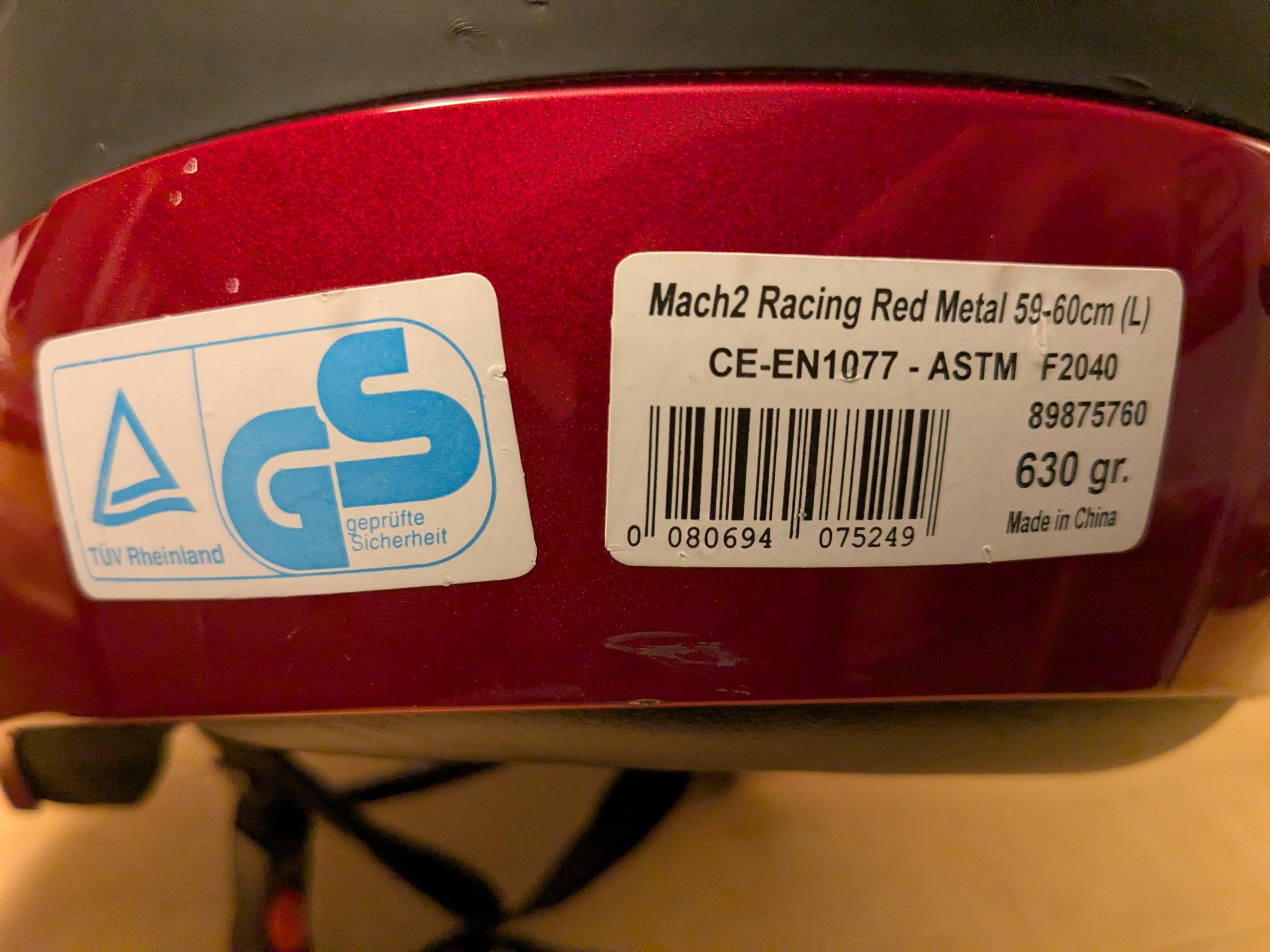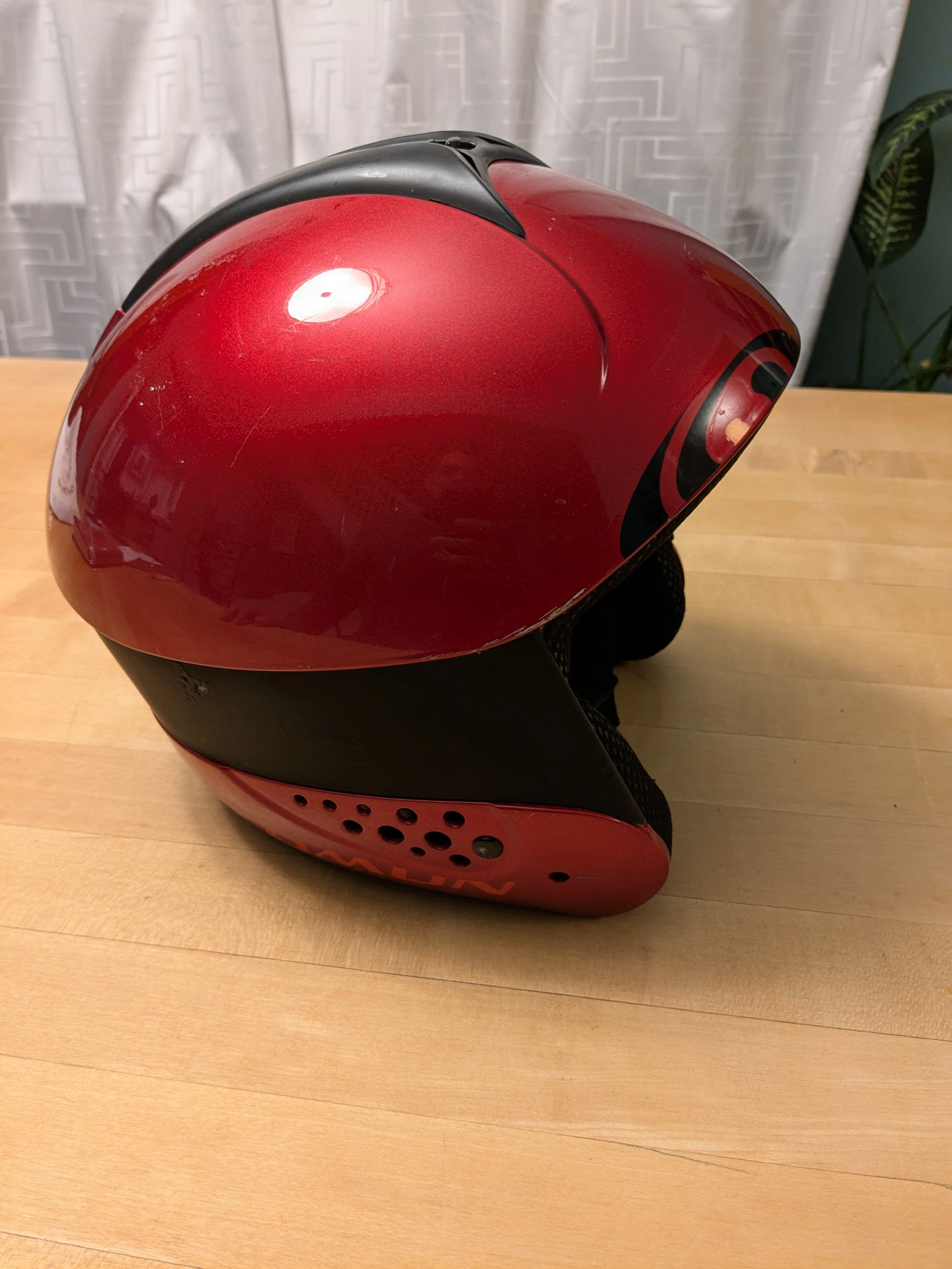 Large red Salomon ski racing helmet. It is older, is missing the goggle clip on the back, and has scratches on the finish, but the padding and strapping are in good condition. Has a vent at the top for warmer weather.