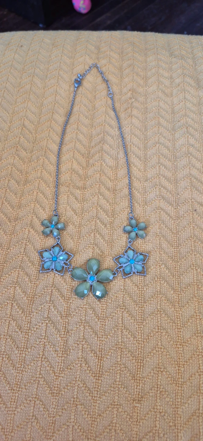 A cute floral necklace with green and yellow stones accents! It's in great condition and ready to add a touch of spring to your outfit, or anytime.