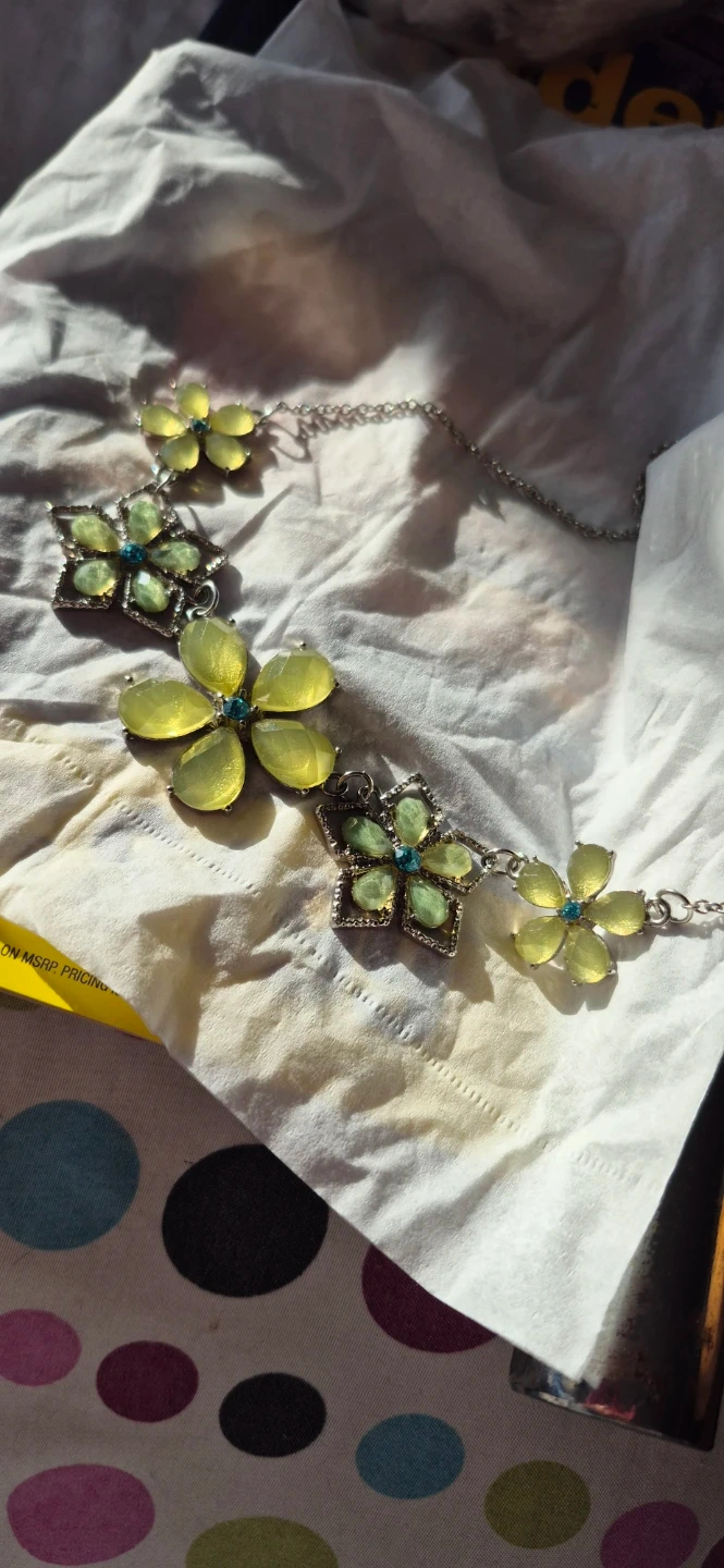 A cute floral necklace with green and yellow stones accents! It's in great condition and ready to add a touch of spring to your outfit, or anytime.
