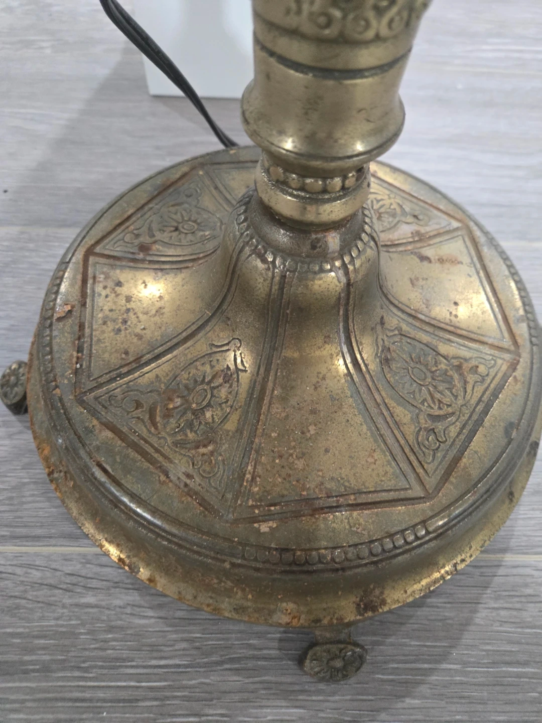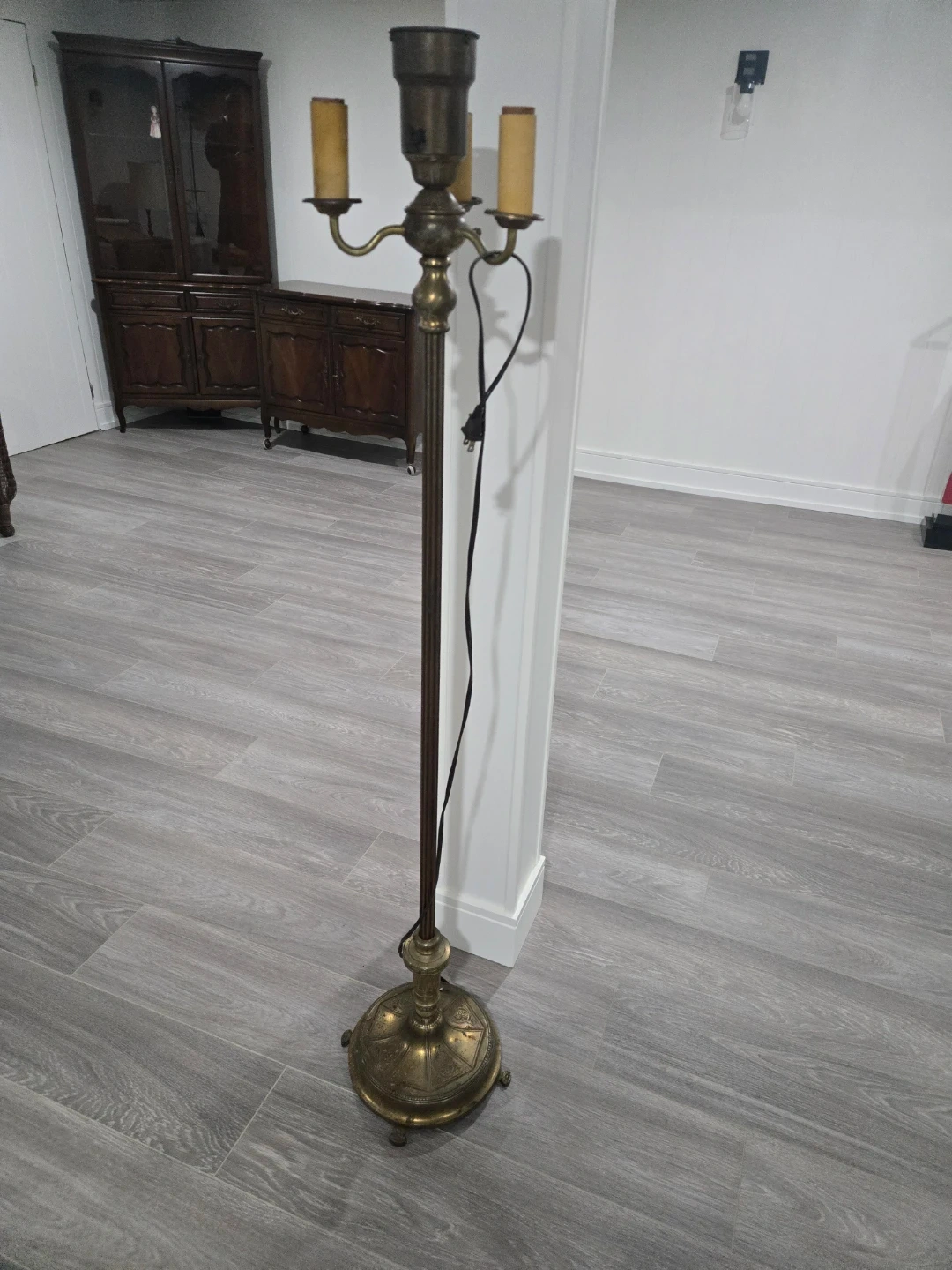 This vintage brass torchiere floor lamp has three arms. It features a decorative base and a central column. The lamp has three sockets for bulbs and a black cord.