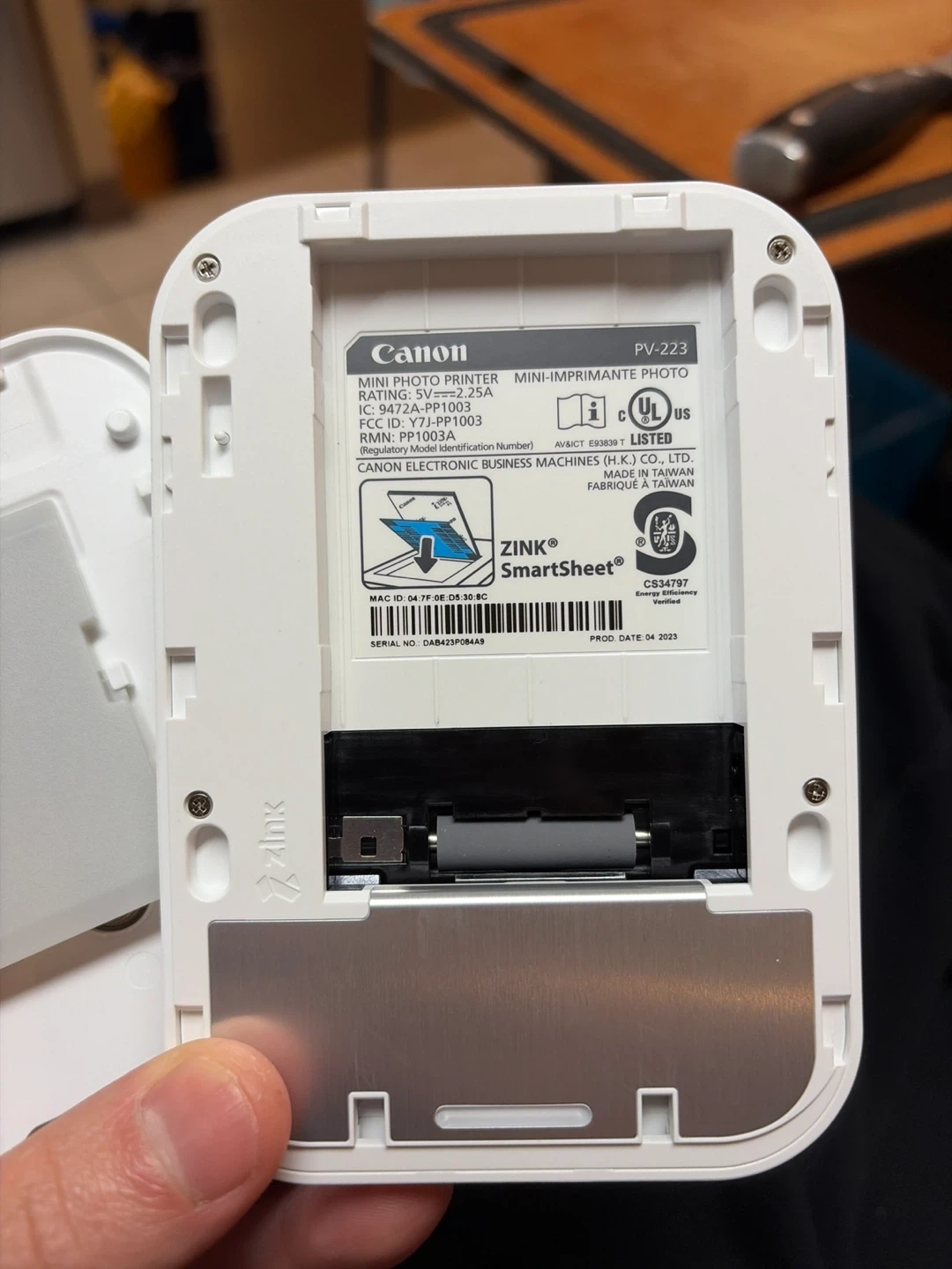 This is a white Canon Ivy mini photo printer. It uses ZINK SmartSheet technology. The production date is April 2023.