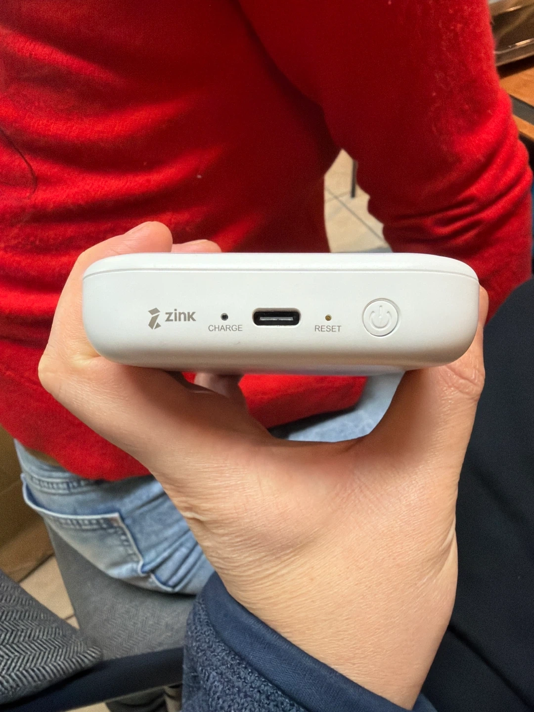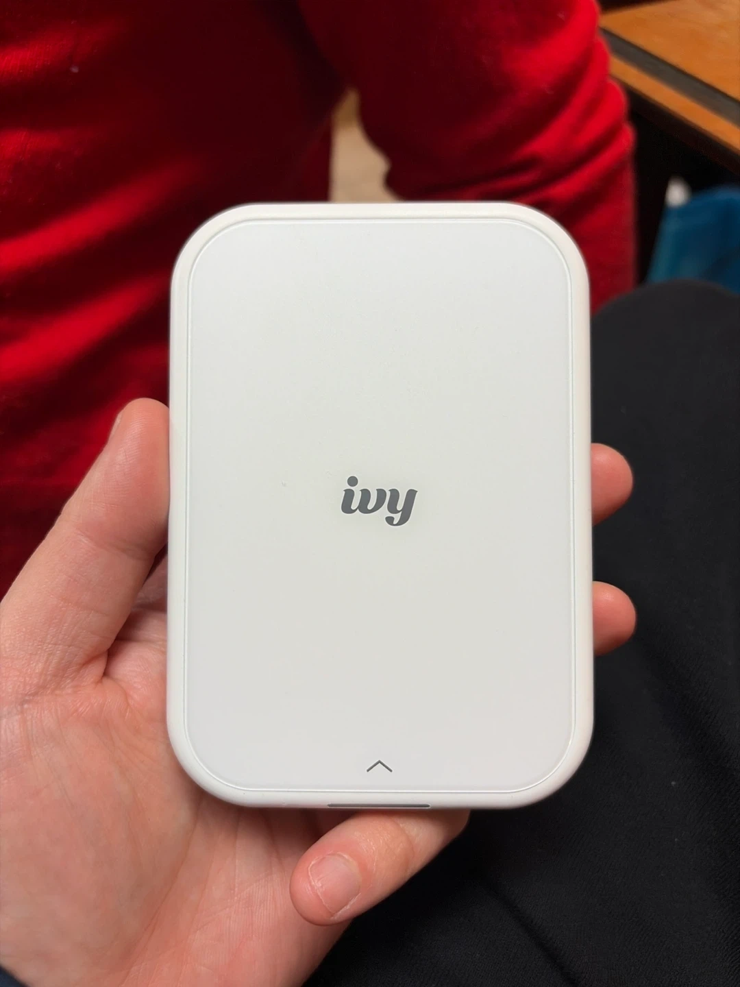 This is a white Canon Ivy mini photo printer. It uses ZINK SmartSheet technology. The production date is April 2023.
