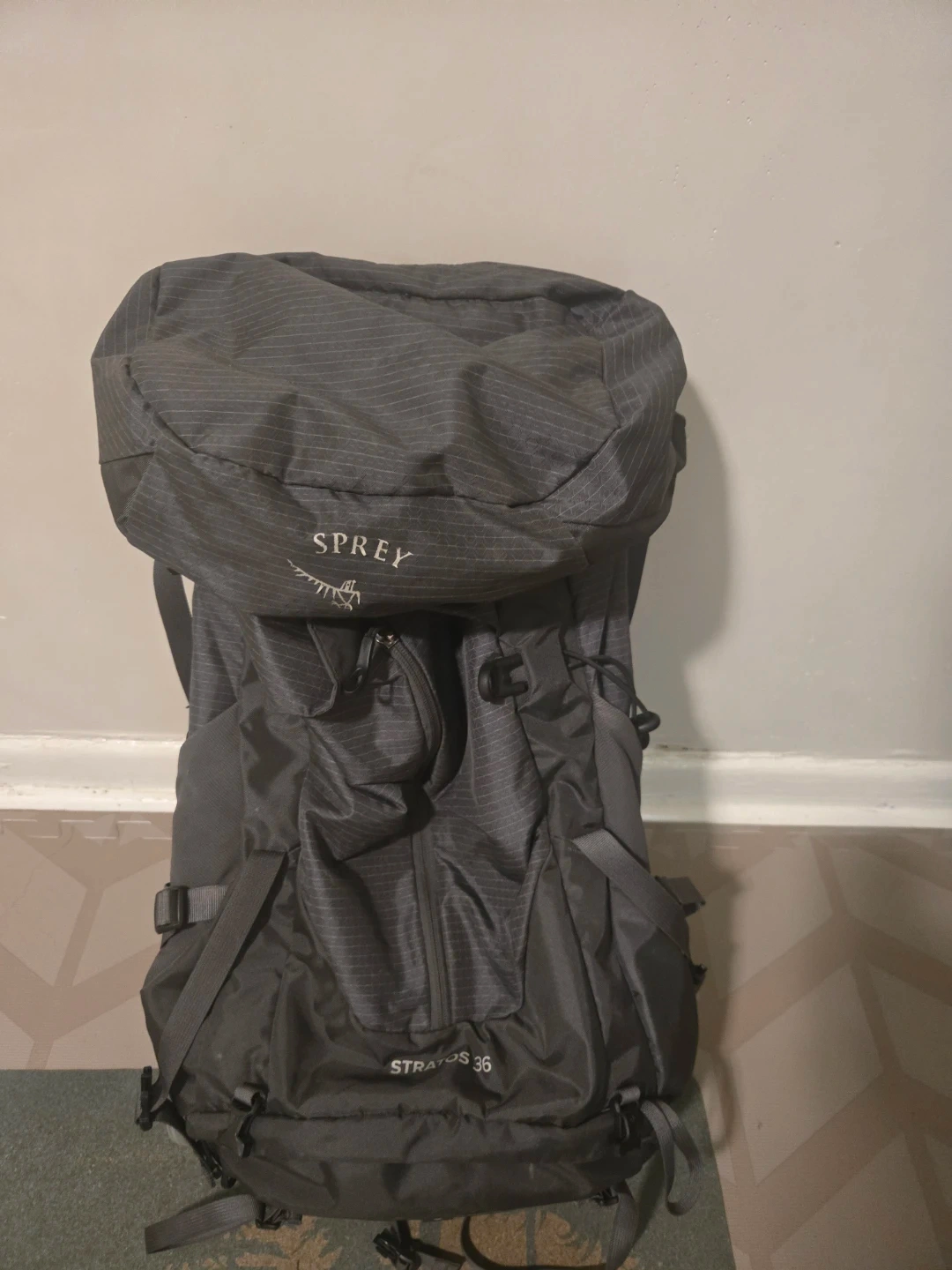This Osprey backpack has a 36-litre capacity. It's made of durable fabric and features adjustable straps for a comfortable fit. Its practical design makes it suitable for day hikes or weekend trips.