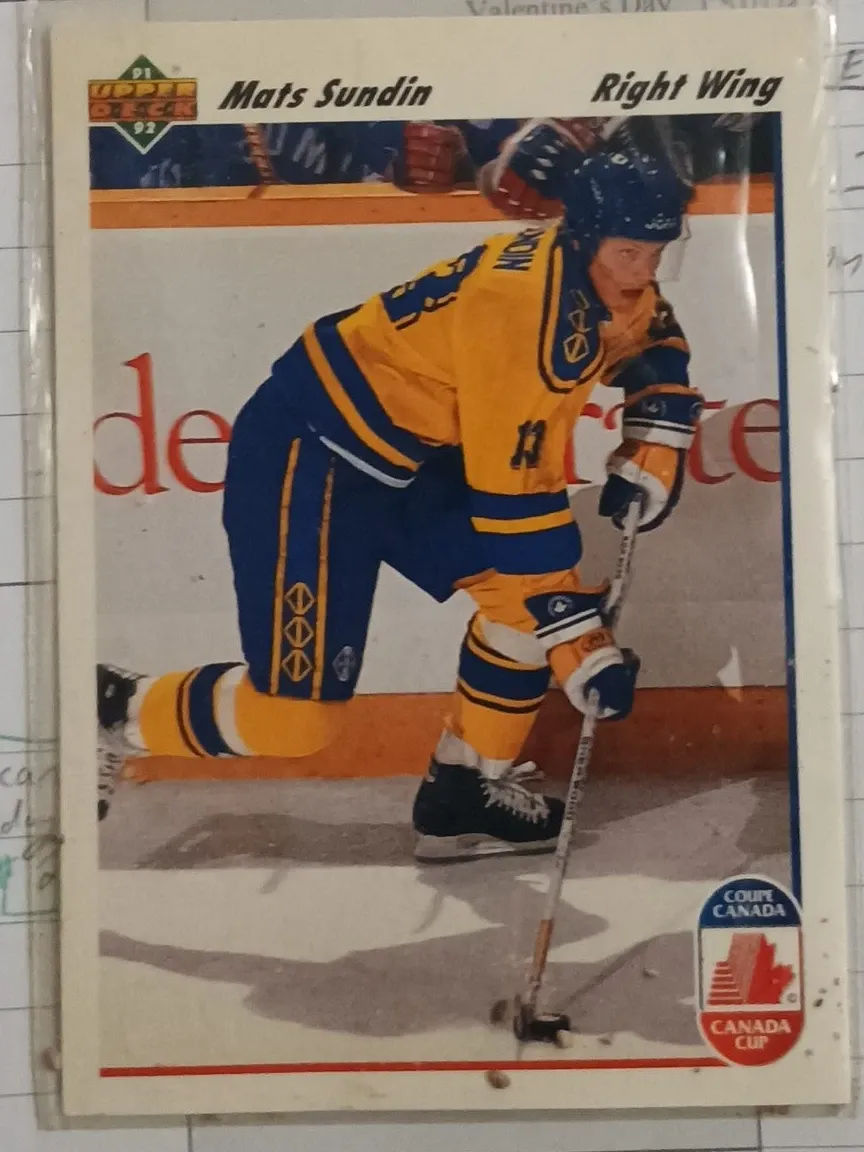 This is a 1991-92 Upper Deck hockey card featuring Mats Sundin. It's a right-wing player card from the Canada Cup series. The card showcases Sundin in action, wearing his team's uniform.