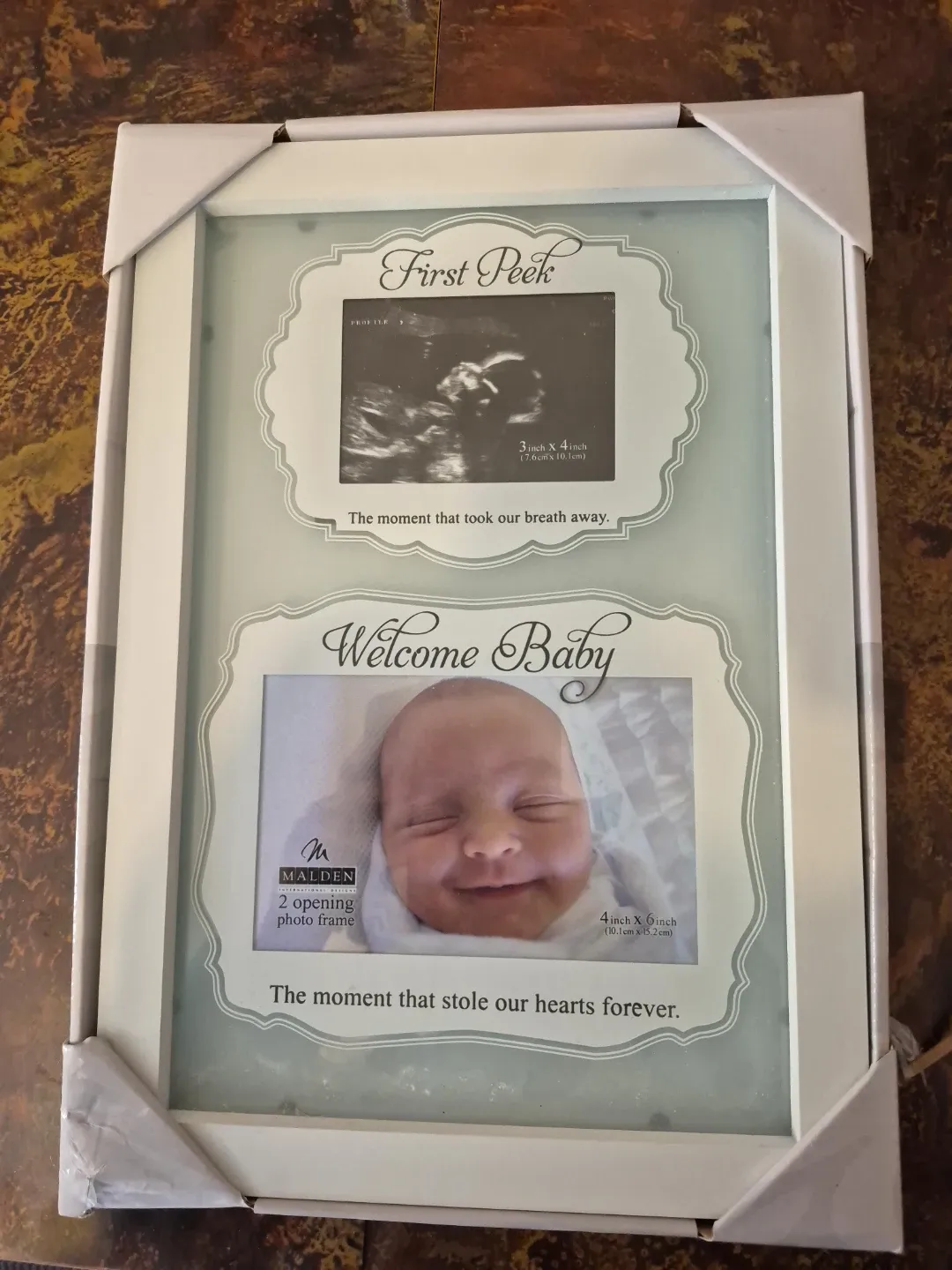 This Malden 2 opening photo frame is perfect for showcasing baby's first ultrasound and a favourite newborn photo. It holds a 3x4 inch image and a 4x6 inch image. The frame has "First Peek" and "Welcome Baby" sentiments.
