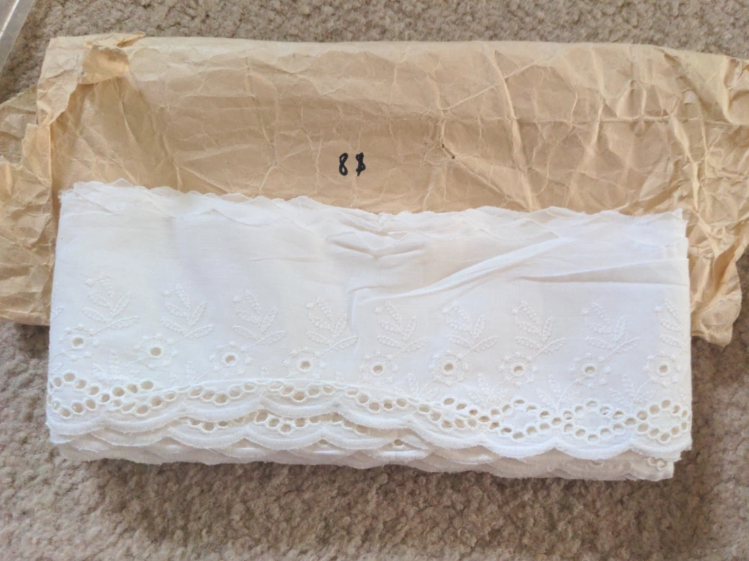 This is a roll of white cotton trim with an eyelet lace design. It's great for sewing projects and crafting. Cotton material.