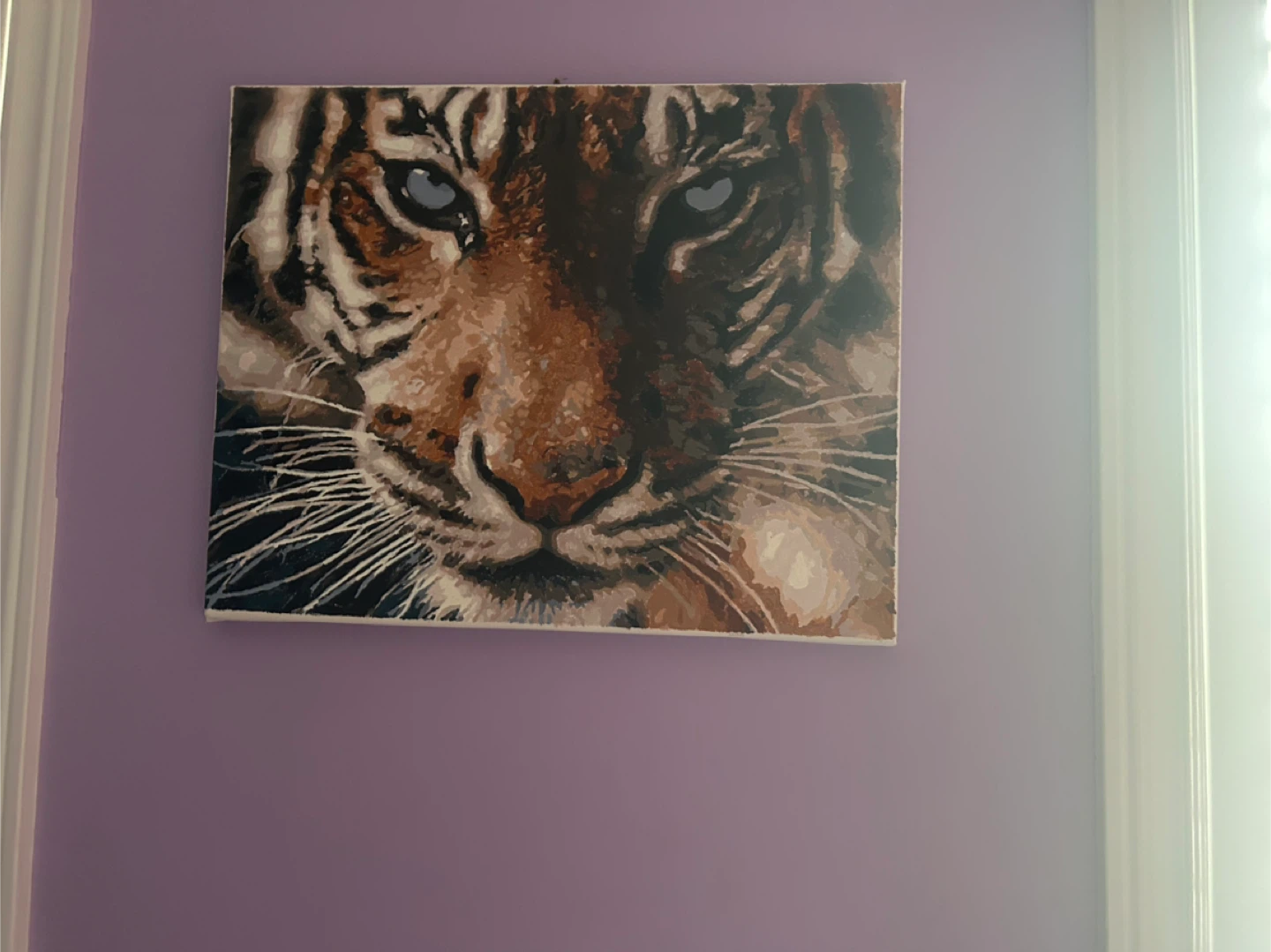 Canvas painting featuring a close-up of a tiger's face. It's a striking piece with detailed stripes and piercing blue eyes. The artwork is mounted on a canvas ready for display.