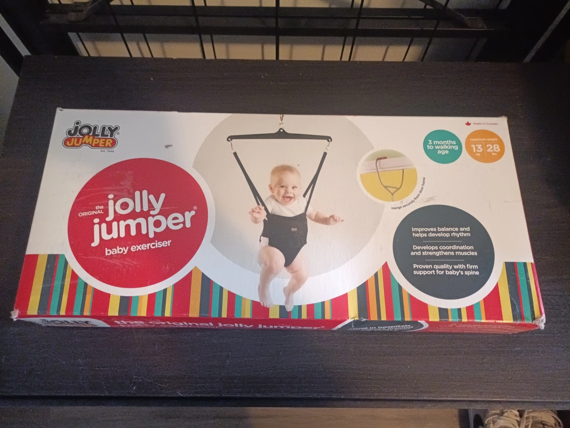 Selling a Jolly Jumper baby exerciser! It's suitable for babies from 3 months to walking age. It helps improve balance and develop rhythm, plus it develops coordination and strengthens muscles. It's designed with proven quality and firm support for baby's spine.