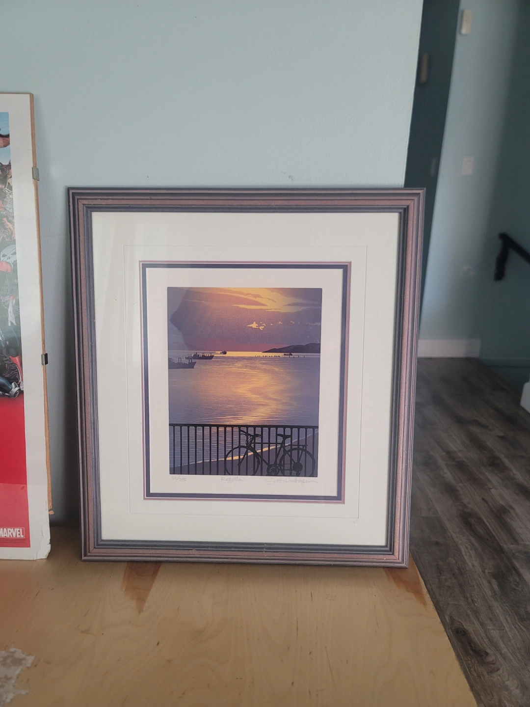 Beautiful framed serigraph print. Features a sunset over water with a bicycle silhouette. Signed and numbered. Nice addition to any home decor.