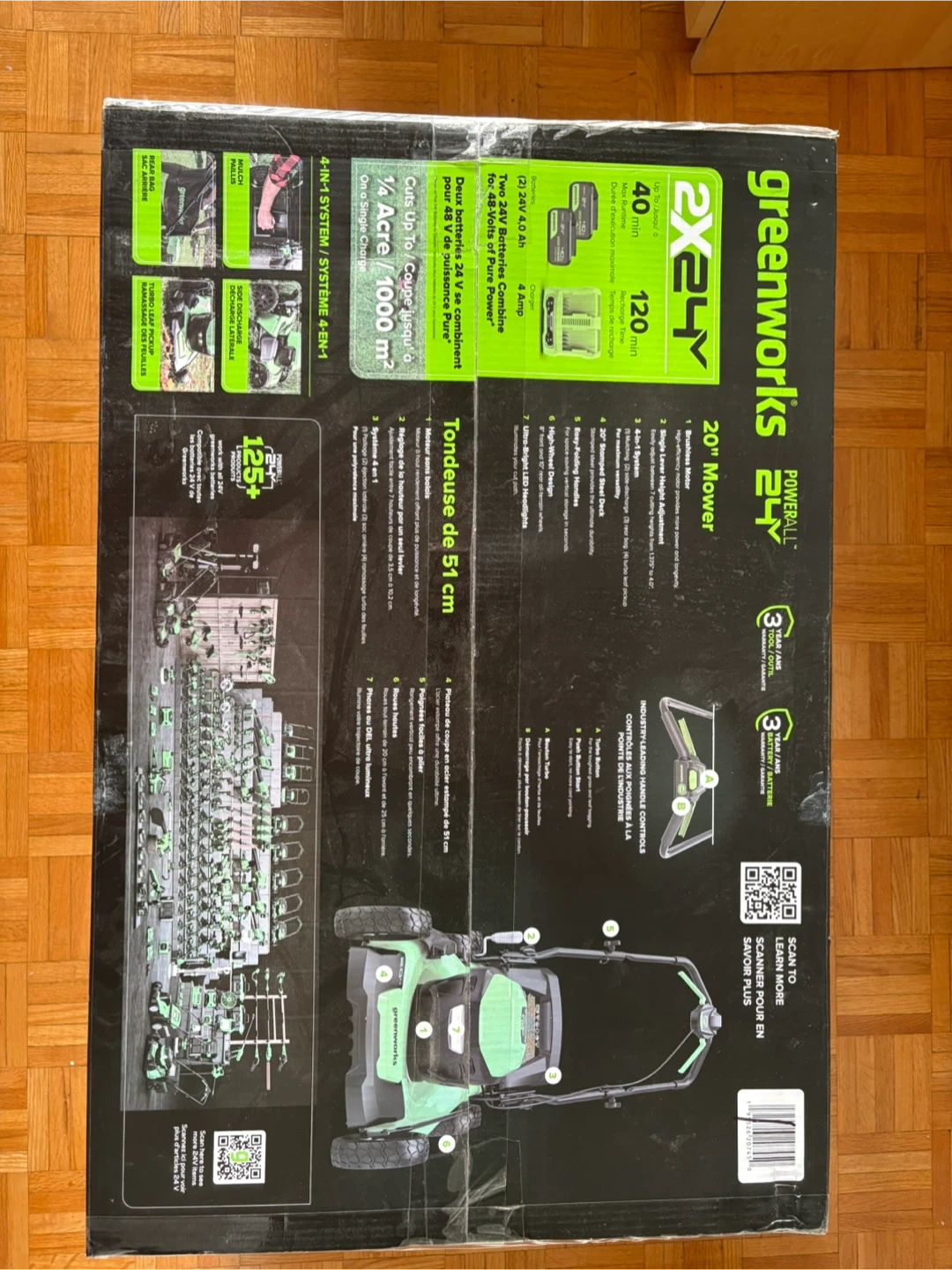 Greenworks 20 inch push mower with brushless motor. It runs on two 24V batteries. Covers up to 1/4 acre on a single charge, with 40 minutes run time. Includes original box and manual.