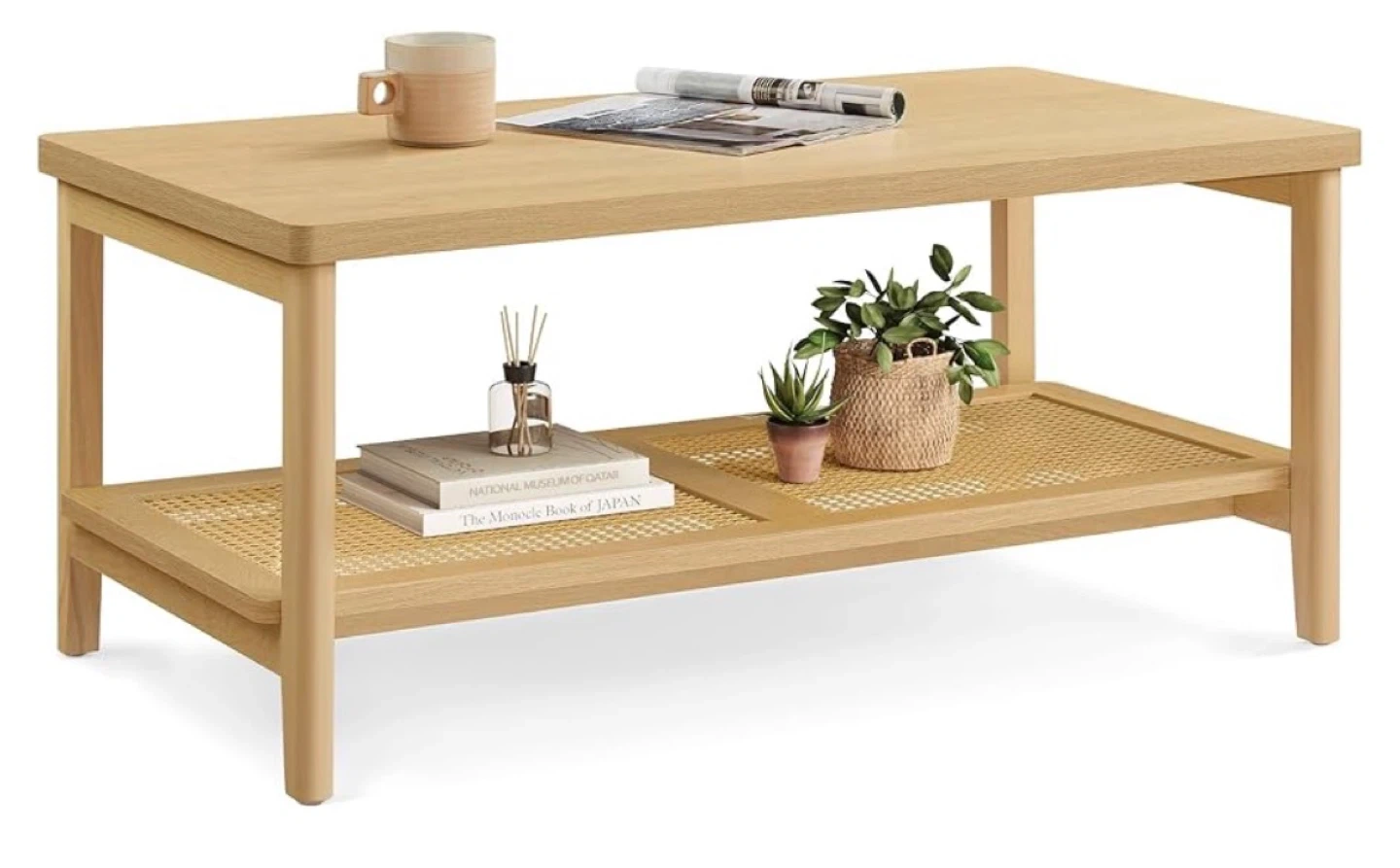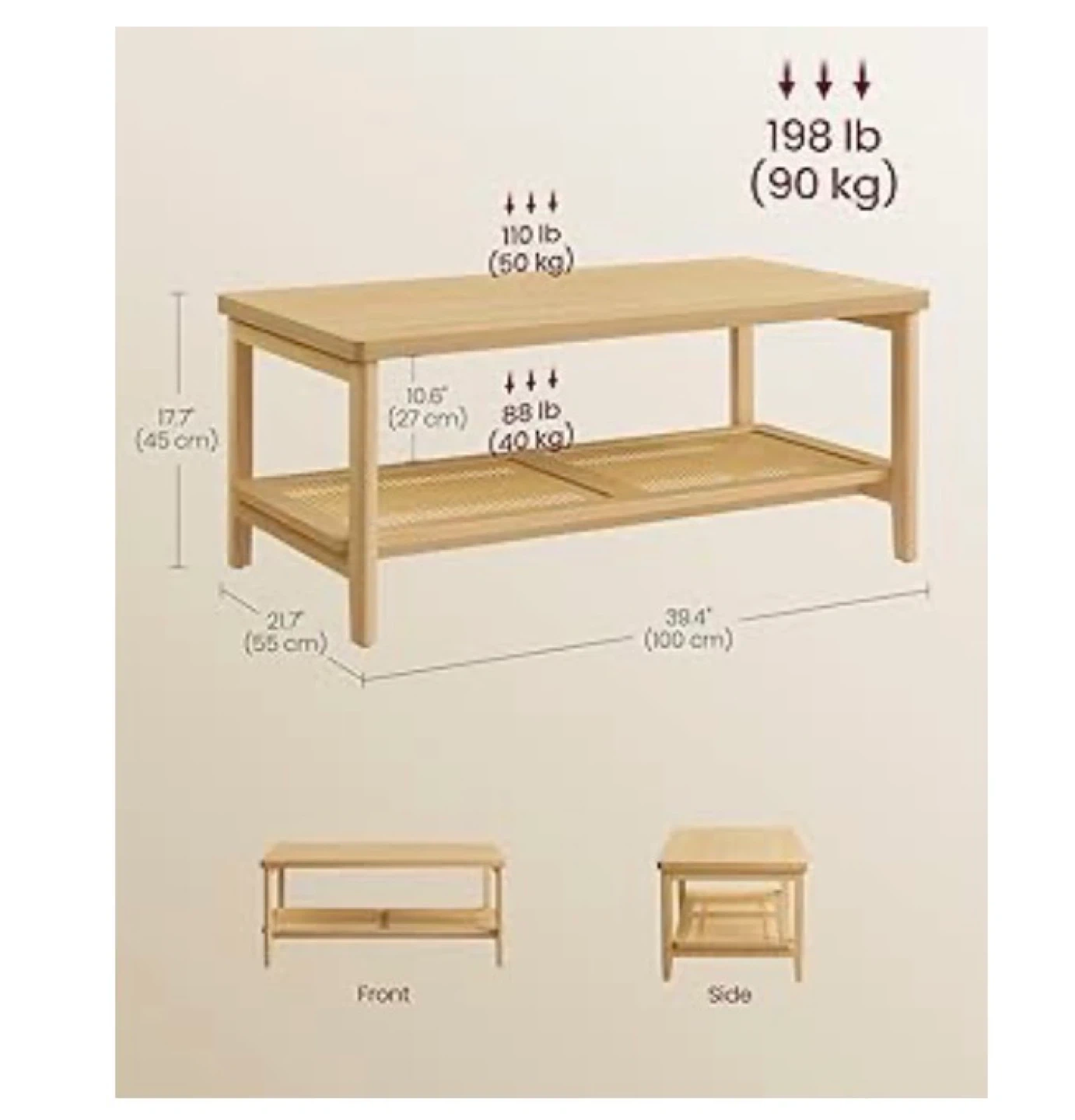 This VASAGLE coffee table is made of wood with a lower shelf for extra storage. It measures 39.4" L x 21.7" W x 17.7" H. The tabletop supports up to 198 lb (90 kg) and the lower shelf supports up to 110 lb (50 kg). It's a sturdy and stylish addition to your living room!