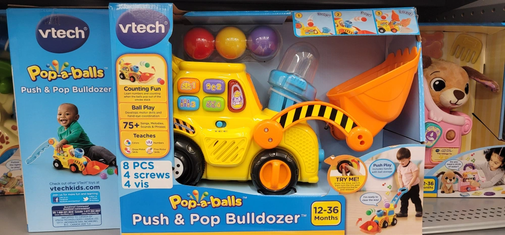Check out this VTech Pop-a-Balls Push & Pop Bulldozer! It's perfect for little ones aged 12-36 months. Your child can enjoy counting fun and ball play with this toy, which includes 75+ songs, melodies, sounds, and phrases. It teaches colours and numbers, and comes with 8 pieces and 4 vis.