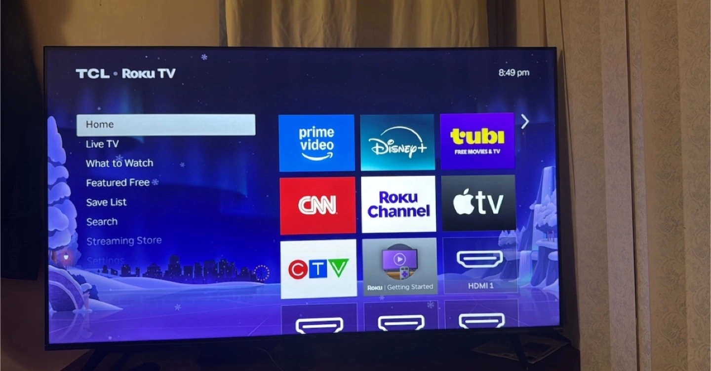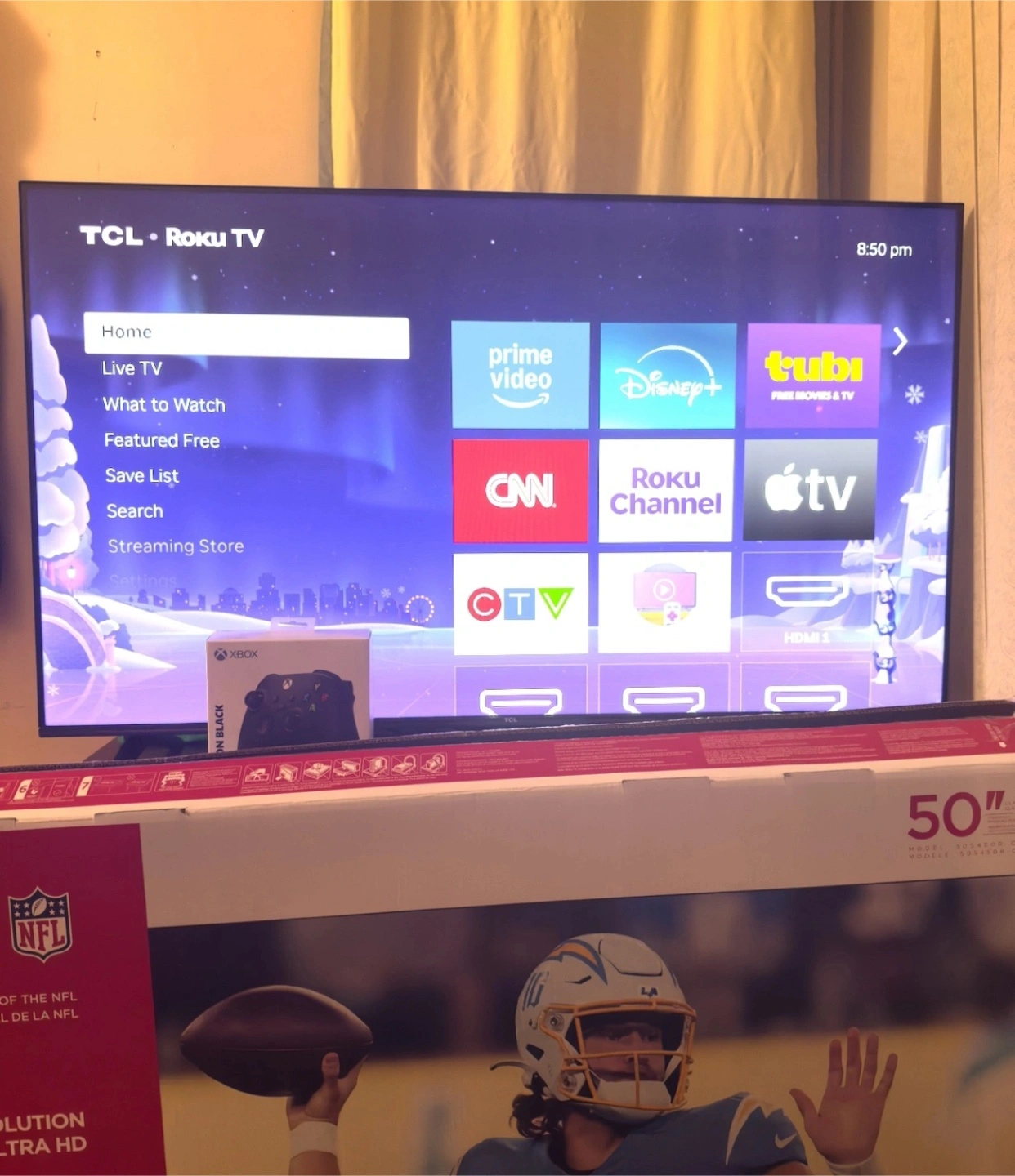 50 inch 4K UHD HDR screen television. Displaying the Roku home screen. It's perfect for watching your favourite shows after a long day. Only 3 months used