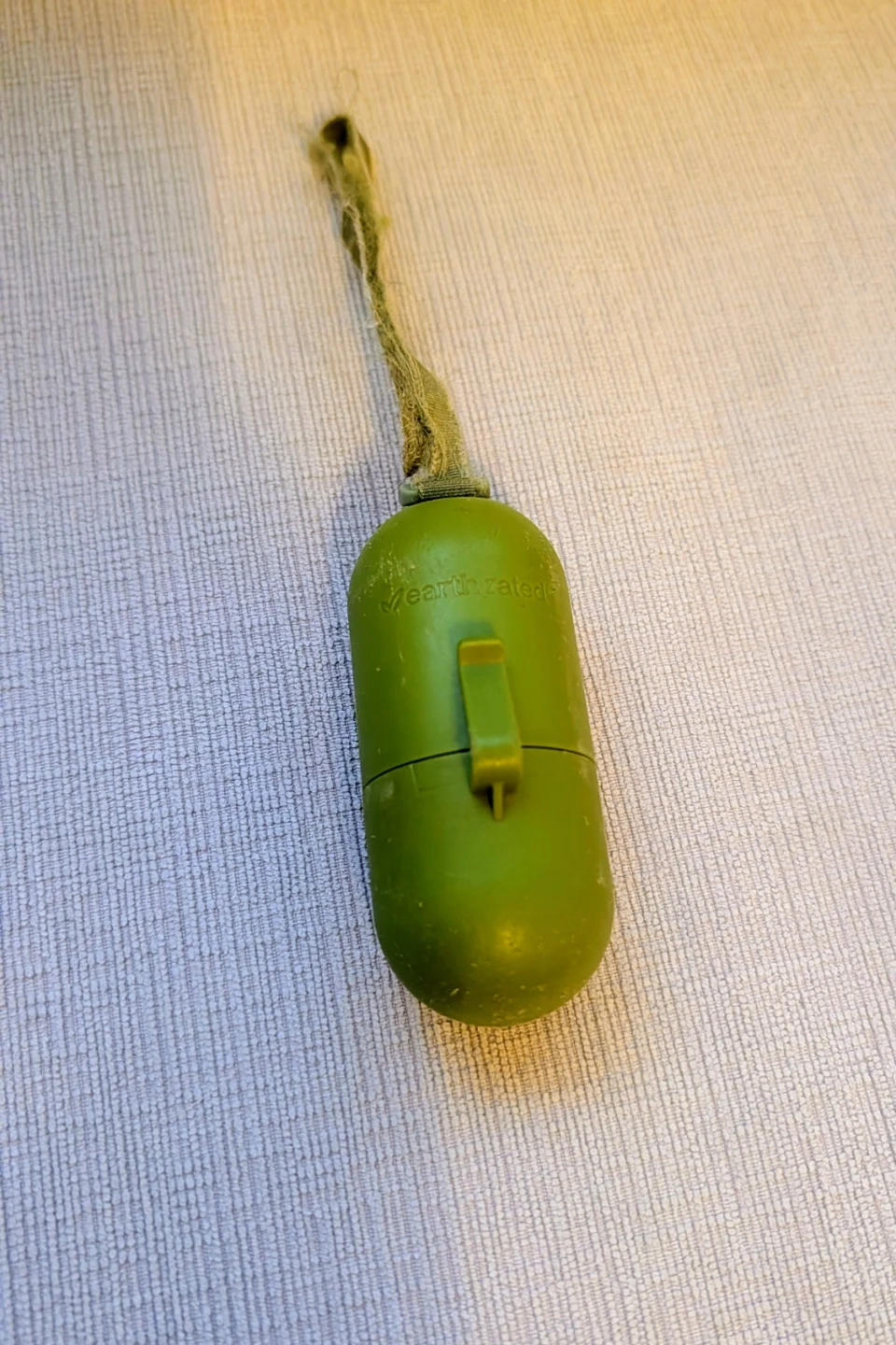 This is an Earth Rated dog waste bag dispenser in green. It's made of durable plastic and includes a loop for easy attachment to a leash. This dispenser is handy for carrying waste bags on walks.