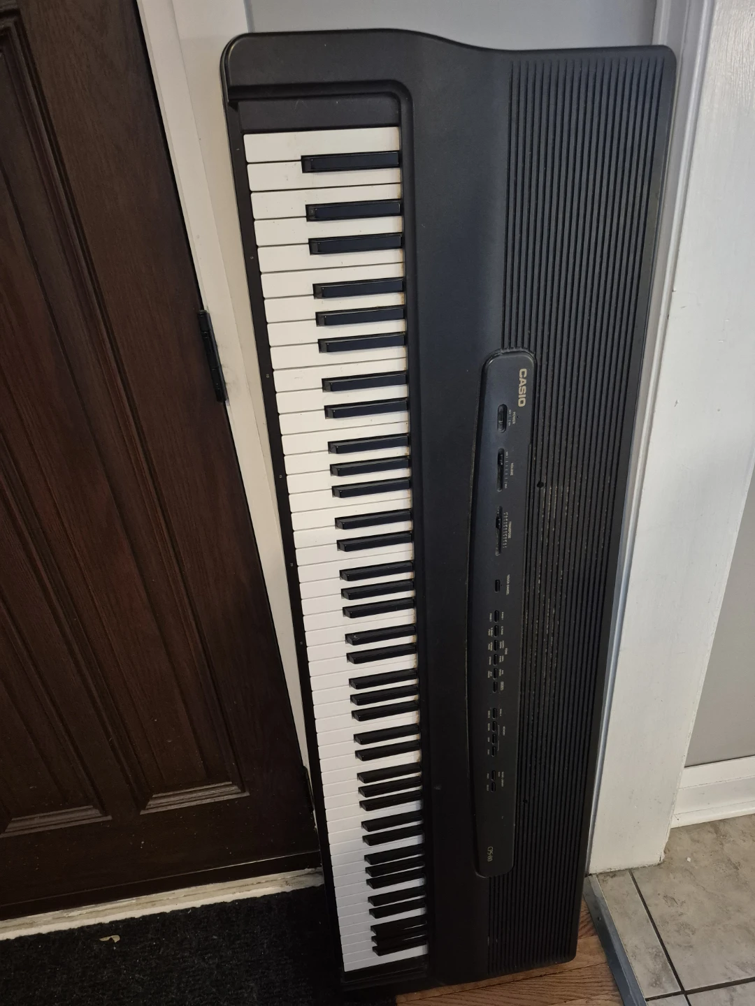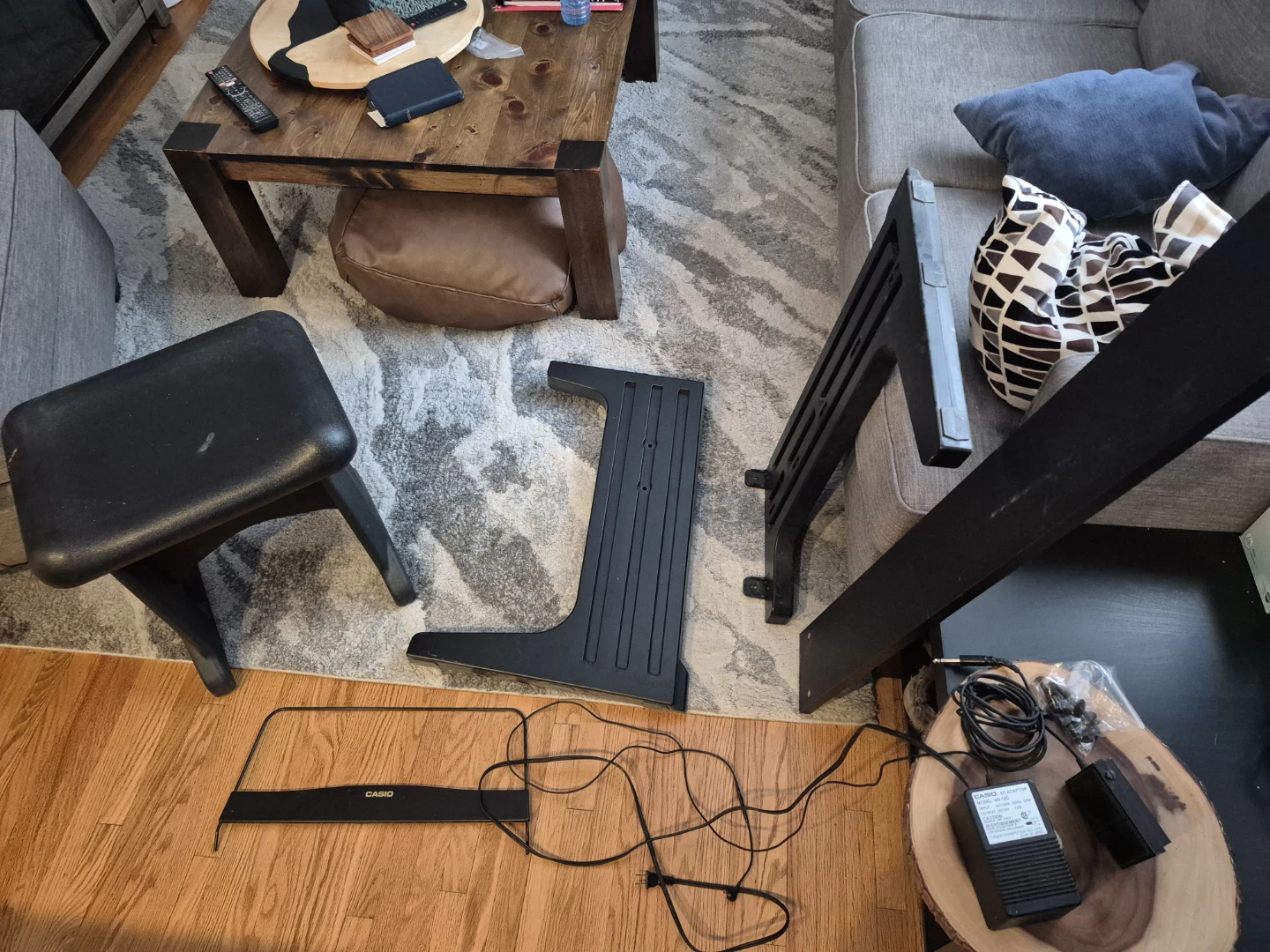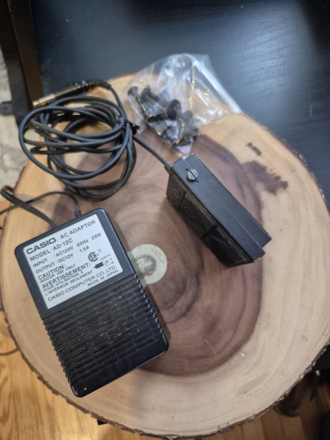 This is a Casio portable keyboard, complete with all its accessories. It includes the keyboard unit and 2 legs, a back and screws requires assembly. A music stand, a sustain pedal, and the AC power adapter is included as well as a matching bench to sit on. It's black and ready for practice or performance!