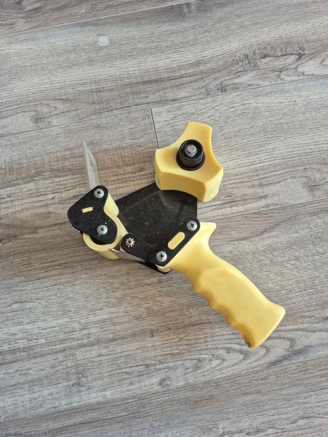 A sturdy tape dispenser with a yellow handle. It's made of durable plastic and metal parts. This tool is handy for sealing boxes quickly!