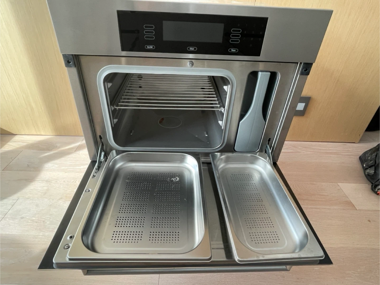 Stainless steel Miele DG ED/CS/USA steam oven. Includes two perforated stainless steel trays and a wire rack.