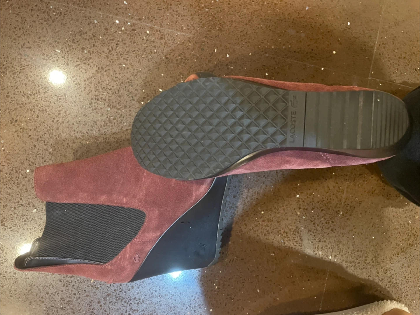 Women's Lacoste ankle boots with a wedge heel. Features suede upper and elastic side panels. The outsole has a diamond tread pattern.