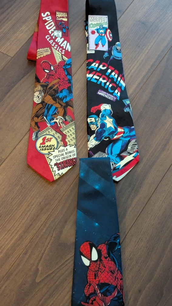 Three neckties featuring Marvel Comics superheroes. One red tie shows Spiderman, another black tie shows Captain America, and a third dark blue tie features Spiderman.