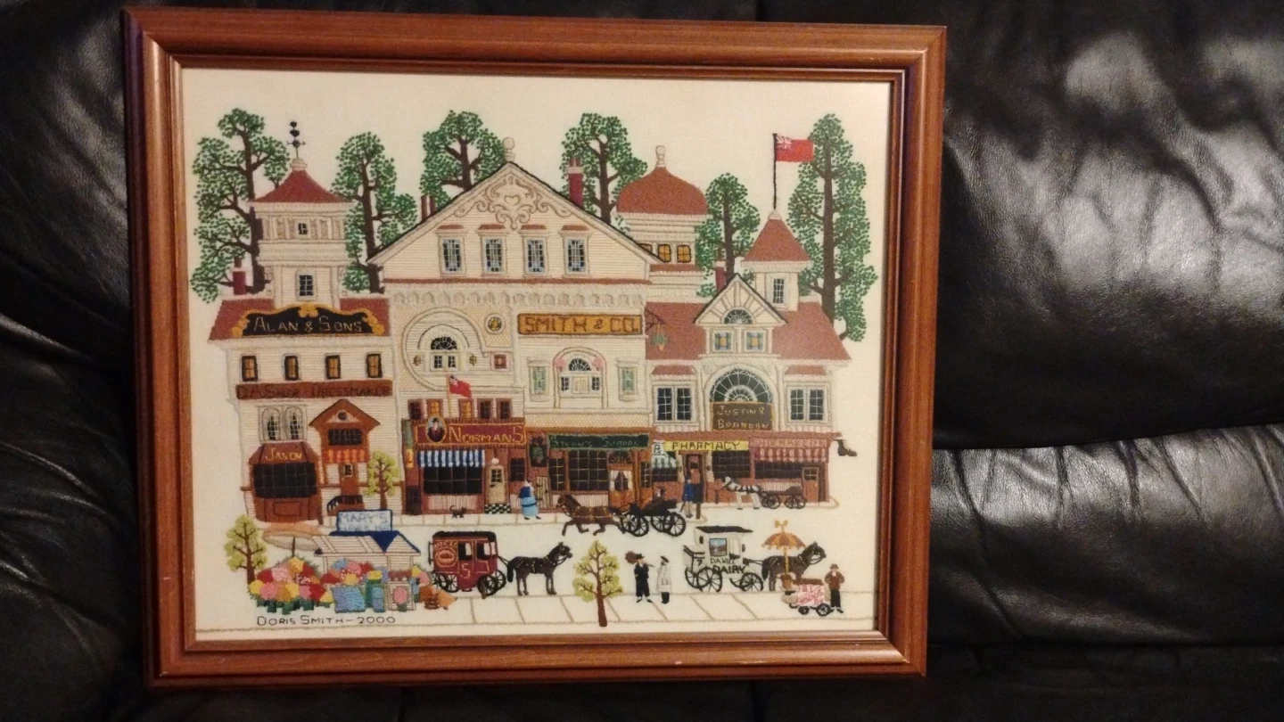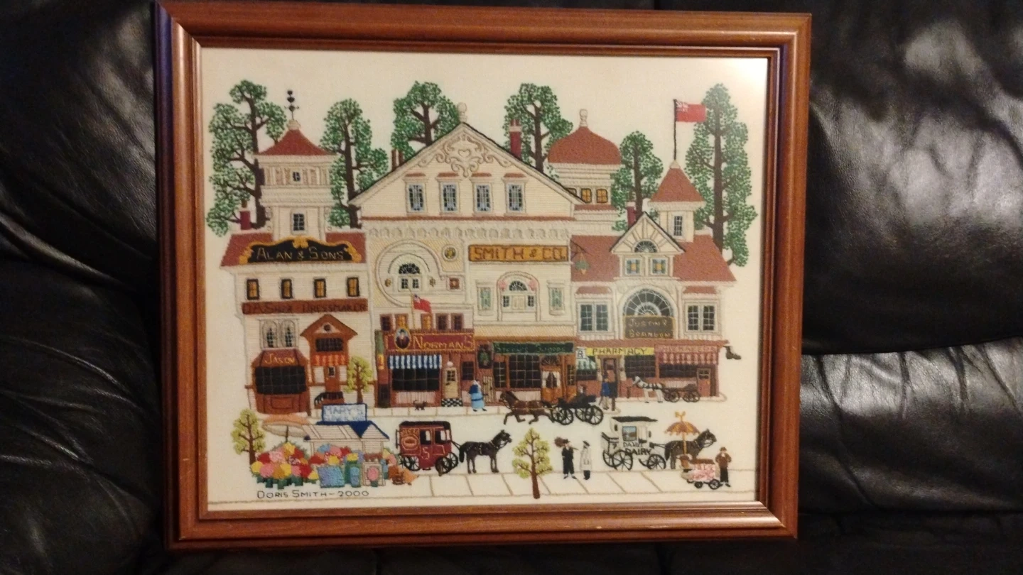 Framed Cross-Stitch "Doris Smith - 2000" Town Scene