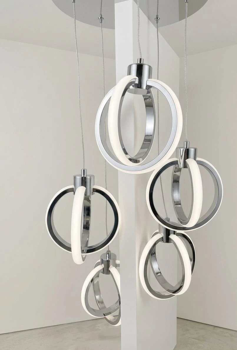 This modern pendant light fixture features a chrome finish with integrated LED lighting. It's designed with multiple rings for a contemporary look. Perfect for adding a stylish touch to any room!
