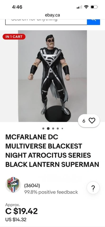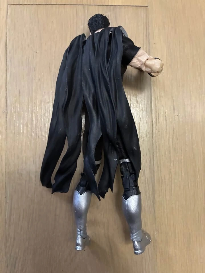 This is a McFarlane Toys DC Multiverse Blackest Night Black Lantern Superman 7-inch action figure. Character: Black Lantern Superman (Earth 2) from the "Blackest Night" storyline. Features: Detailed zombie head sculpt with red eyes, black markings, and a torn cape. Articulation: Includes double-jointed elbows and knees, allowing for a good range of posing. Sells for $20 online.