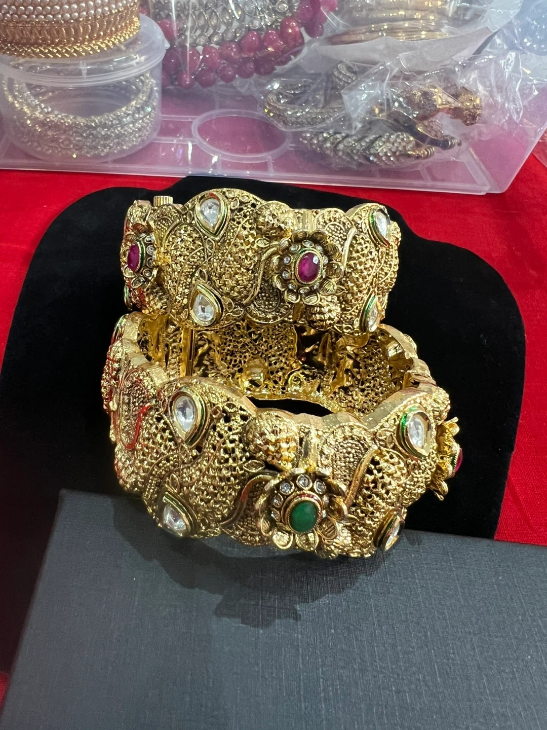 Beautiful gold-toned bangles with intricate detailing and colourful stones. They're in great look ready to add some sparkle to your outfit!