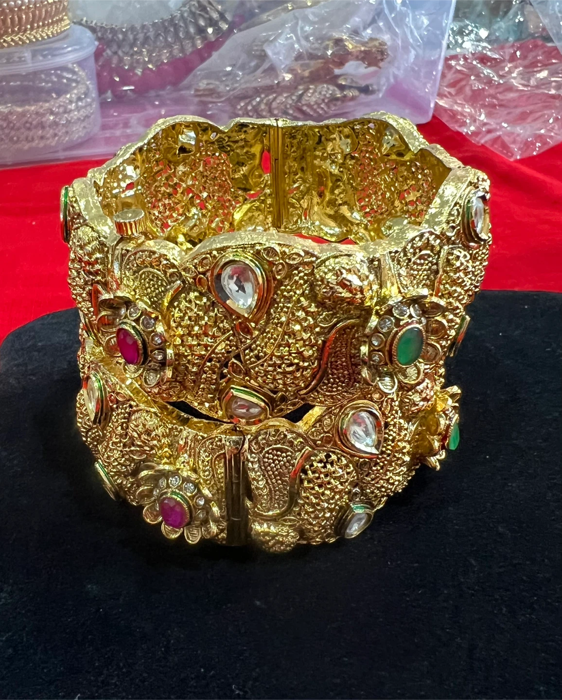 Beautiful gold-toned bangles with intricate detailing and colourful stones. They're in great look ready to add some sparkle to your outfit!