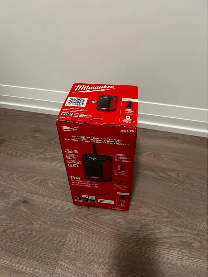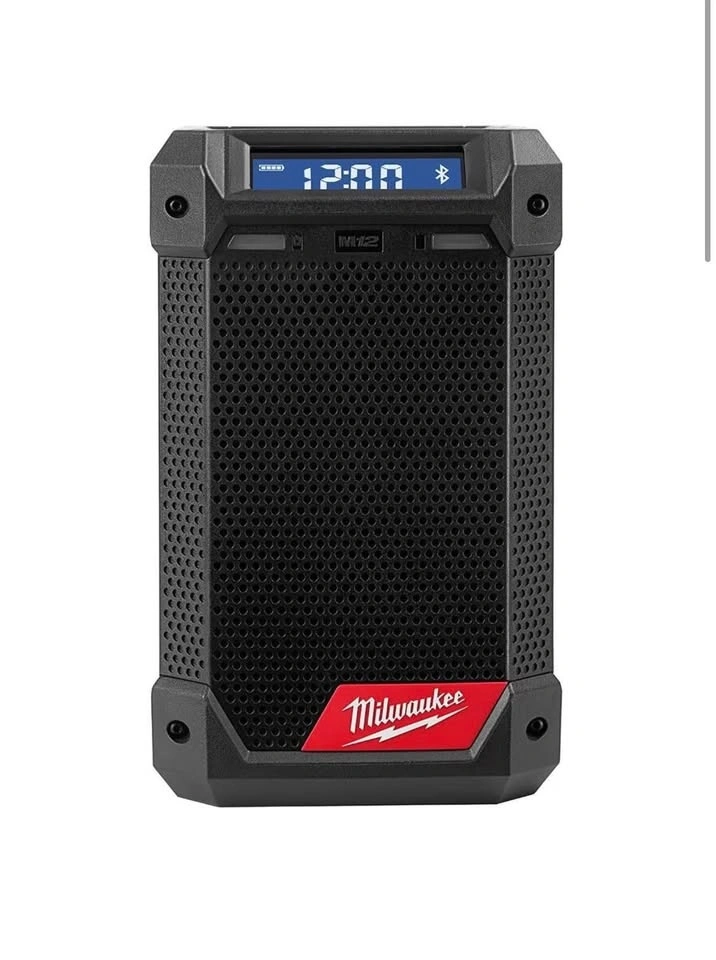 Milwaukee M12 Bluetooth AM/FM jobsite radio and charger. Charges M12 batteries and mobile devices at 2.1Ah. Has a full range speaker and tweeter for great sound. Super portable with a small footprint. Built-in hanging solutions too. Tool only, no battery.