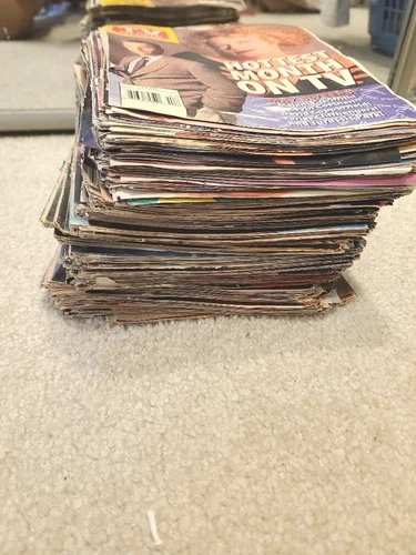 Selling a lifetime collection of TV Guide magazine covers, primarily from the 1970s up to the 1990s. Many are just the front cover, while others have the front and back cover intact. The pages are in chronological order and the pile is about 4 inches tall, weighing approximately 2.1 kilograms. You might find some rare or unusual covers from these decades. Some covers may have writing or creasing. This is a great lot for collectors!