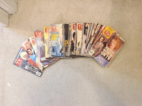 Selling a lifetime collection of TV Guide magazine covers, primarily from the 1970s up to the 1990s. Many are just the front cover, while others have the front and back cover intact. The pages are in chronological order and the pile is about 4 inches tall, weighing approximately 2.1 kilograms. You might find some rare or unusual covers from these decades. Some covers may have writing or creasing. This is a great lot for collectors!