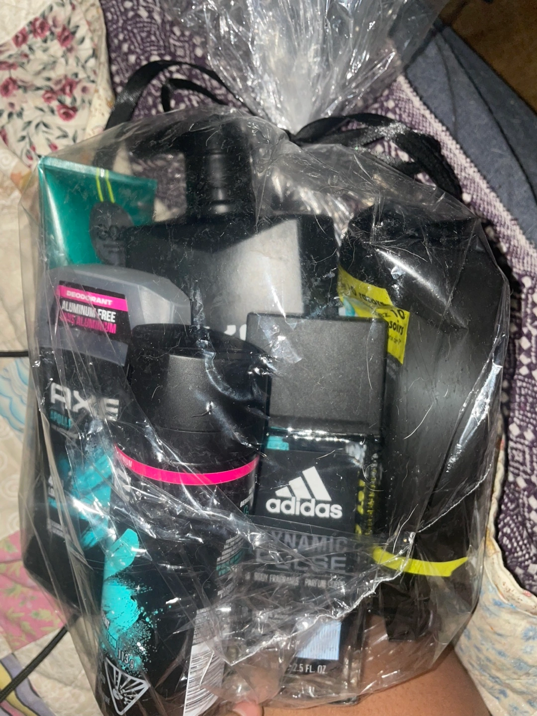 Gift set includes Axe body wash, Axe deodorant, Adidas cologne, and another cologne, all in full-size bottles.