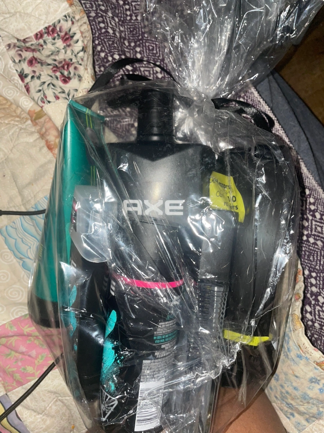 Gift set includes Axe body wash, Axe deodorant, Adidas cologne, and another cologne, all in full-size bottles.