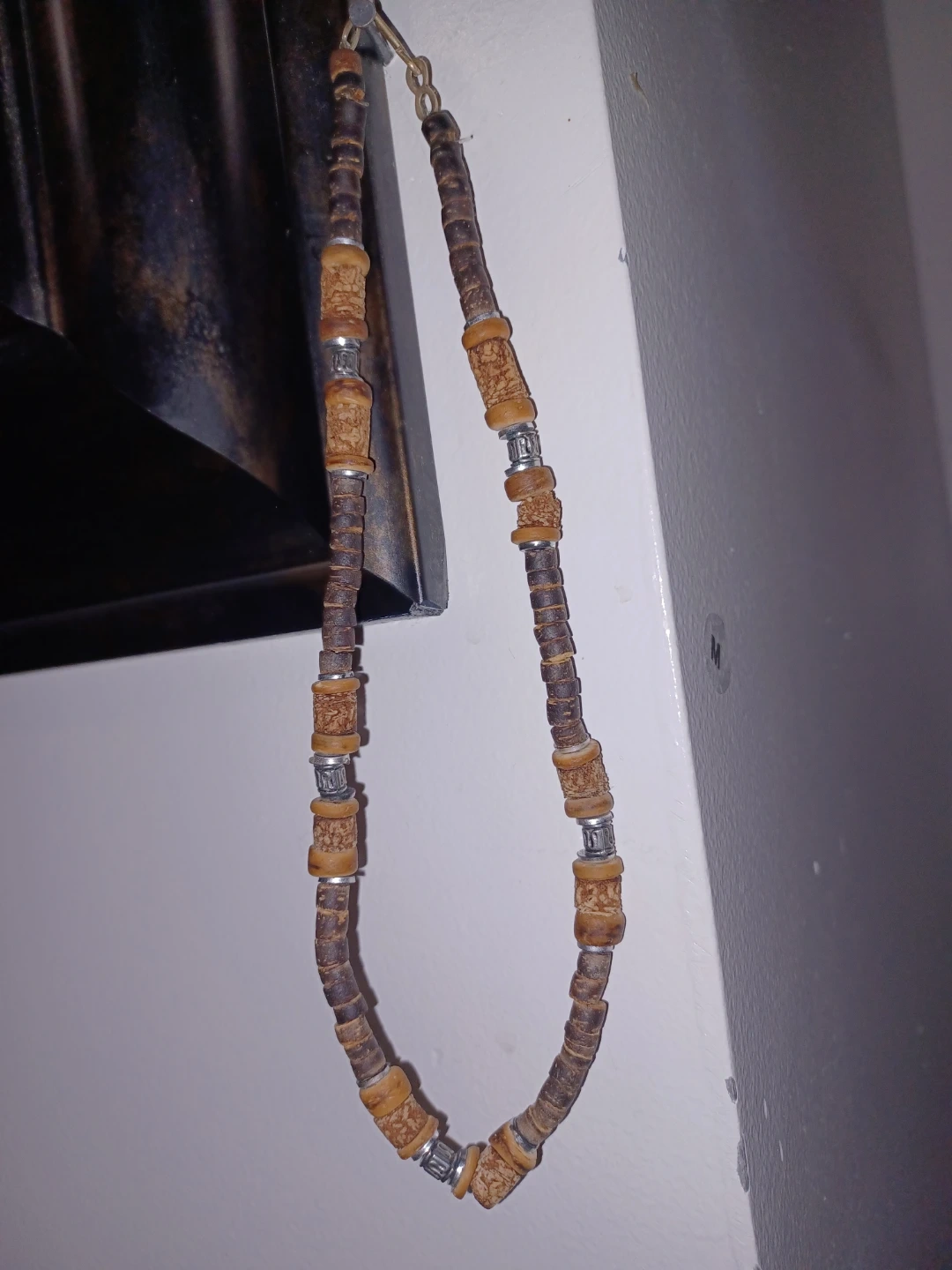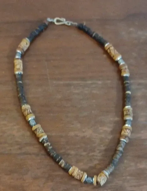 A beaded necklace featuring brown and tan beads with silver accents. It has a toggle clasp closure. This necklace is made from wood and possibly other natural materials.