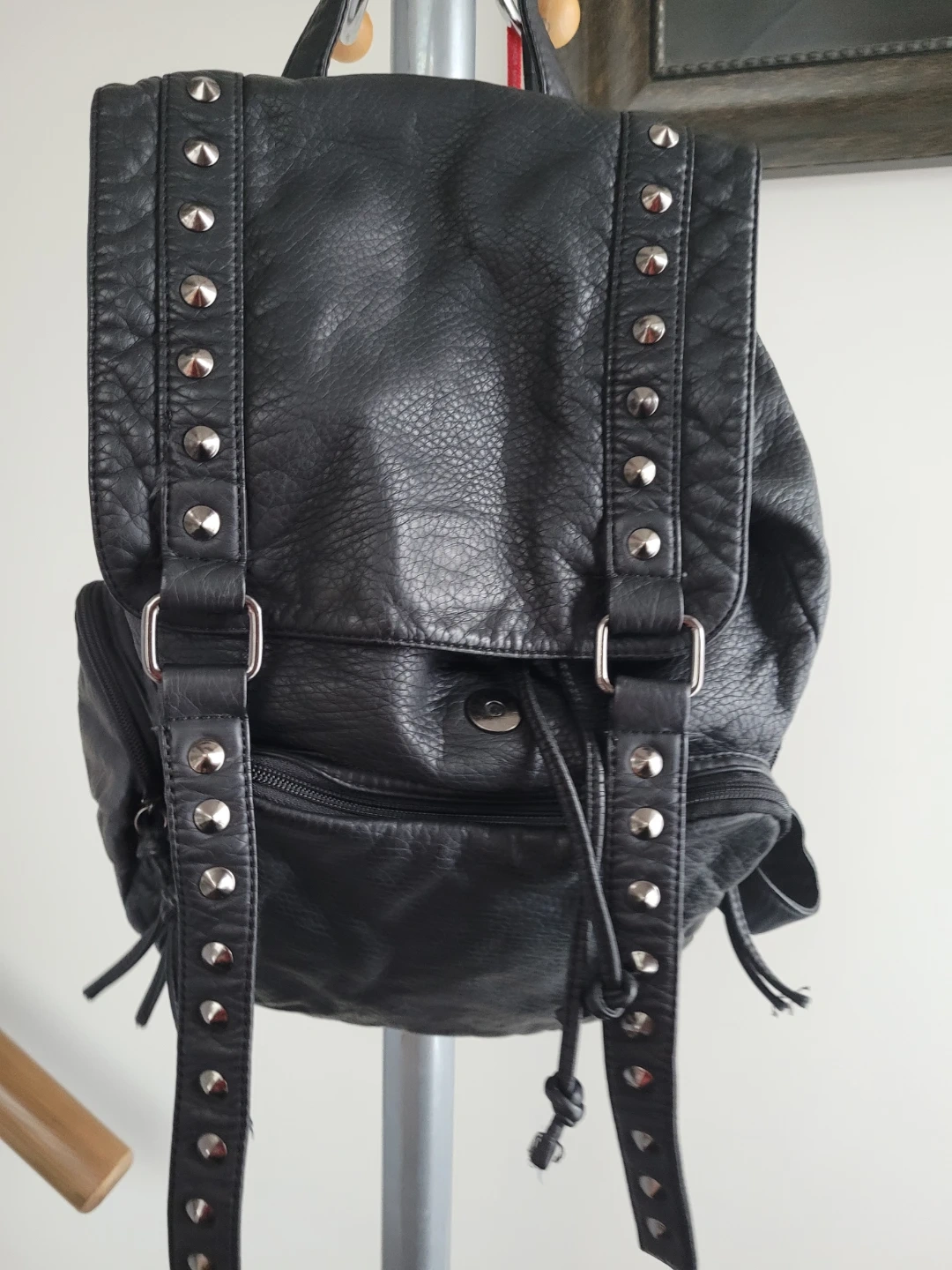 This black faux leather backpack features stylish silver stud accents. It has adjustable shoulder straps for comfort. Great for everyday use!