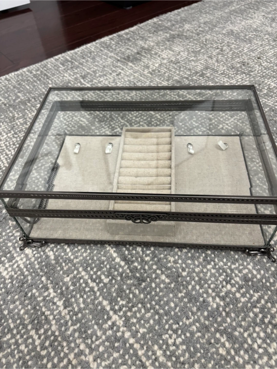 Two glass jewelry boxes for storing rings and trinkets. One features a detailed silver-toned filigree design and a mirrored interior. The other is a larger rectangular box with a ring organizer insert.