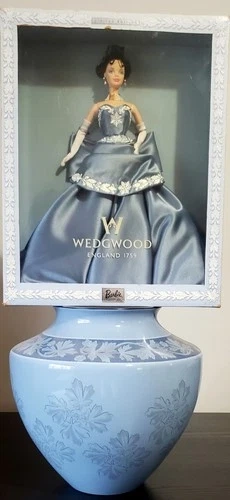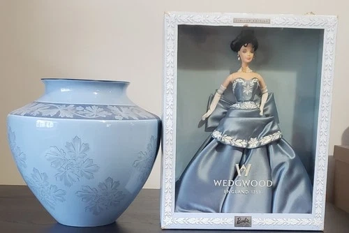 This exquisite Wedgwood Gift Set is a true collector's treasure. Featuring the iconic Wedgwood Barbie, this set also includes a beautifully crafted Wedgwood Interiors large Jardiniere Vase from 1999, in the same beautiful color and pattern to complement the doll. This set is perfect for any fan of Barbie, unique and decorative collectibles, or Wedgwood enthusiasts. The Barbie doll is brand new in its original box, making it a great addition to any collection or display. The matching Jardiniere Vase adds a touch of elegance to any room and is sure to be a conversation starter. Don't miss your chance to own this stunning Wedgwood Gift Set.