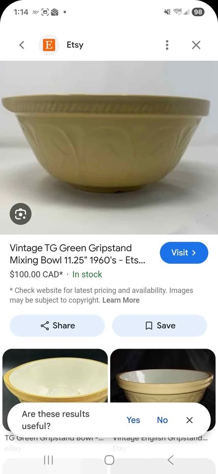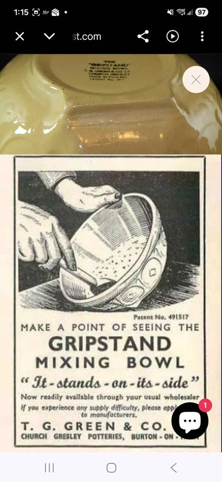 Buy & SellVintage 1960 T.G. Green Gripstand Mixing Bowl - 13 inchVintage 1960 T.G. Green Gripstand Mixing Bowl - 13 inch$50Pick up Forest Heights. One mark on it I can't seem to remove, shown in pictures.WHERE TO MEETCheck LocationView MapSELLERKrissy MarieForest Heights754 reviews0 chats·0 favorites·7 viewsSEND CHAT TO SELLERHi Krissy Marie! I’m interested in your listing.Hi Krissy Marie! I’m interested in your listing.Get the Karrot app to chatSign In to chat