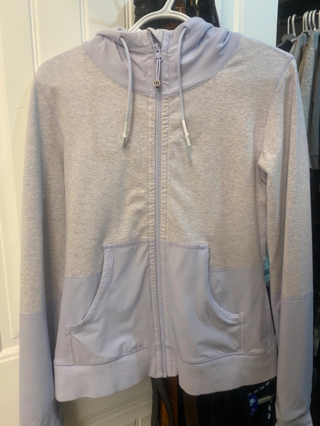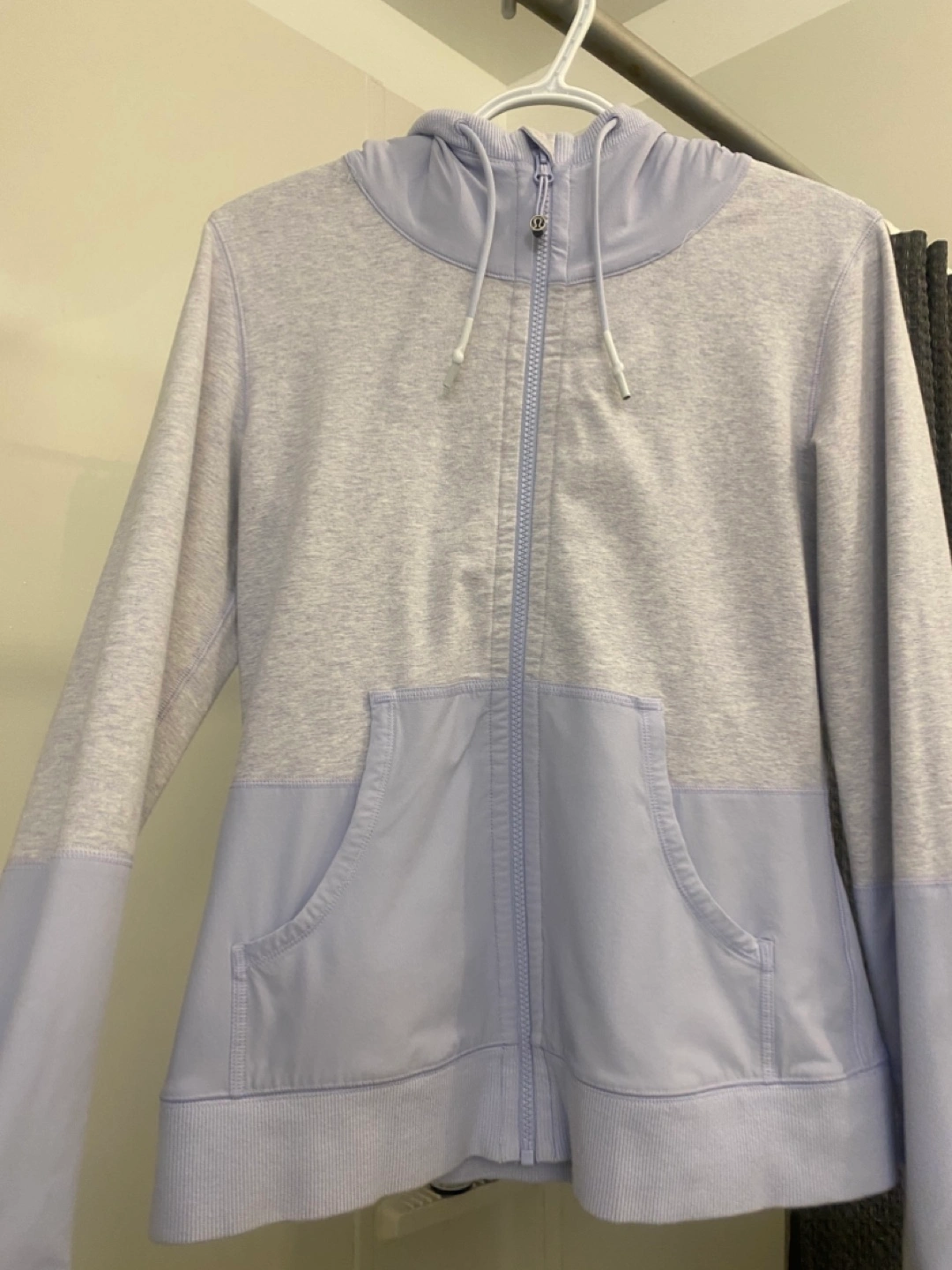 Lululemon zip-up hoodie. Two-tone colour block design. Features a hood and pockets. Great for layering or wearing on its own. Size 6 kind of periwinkle in colour . Pick up Port Elmsley