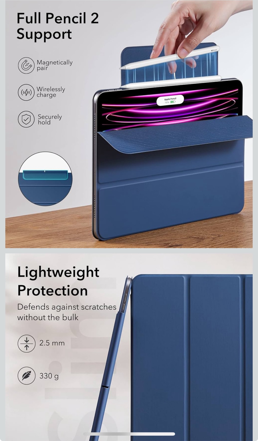 Selling a new ESR Rebound 360 Series case for the iPad Pro 12.9 inch. It's a beautiful purple colour and offers multi-angle adjustments. It also features full Pencil 2 support with magnetic pairing and wireless charging. This case provides lightweight protection, defending against scratches without the bulk. Enjoy powerful magnetic attachment and a stable trifold stand for added versatility