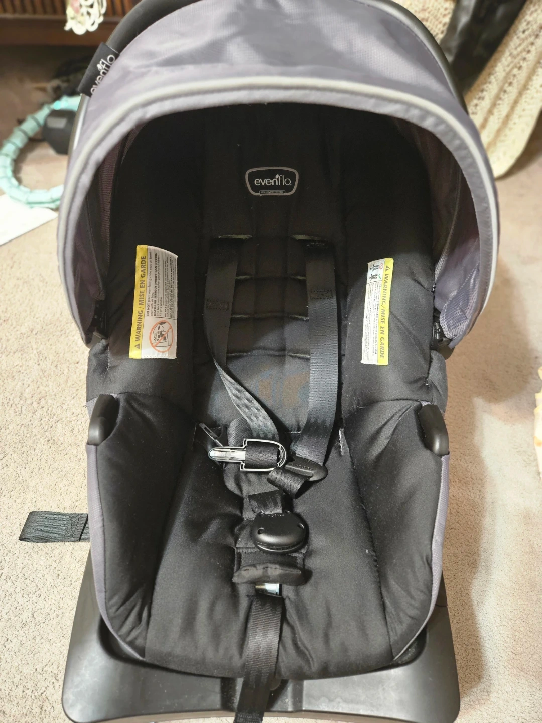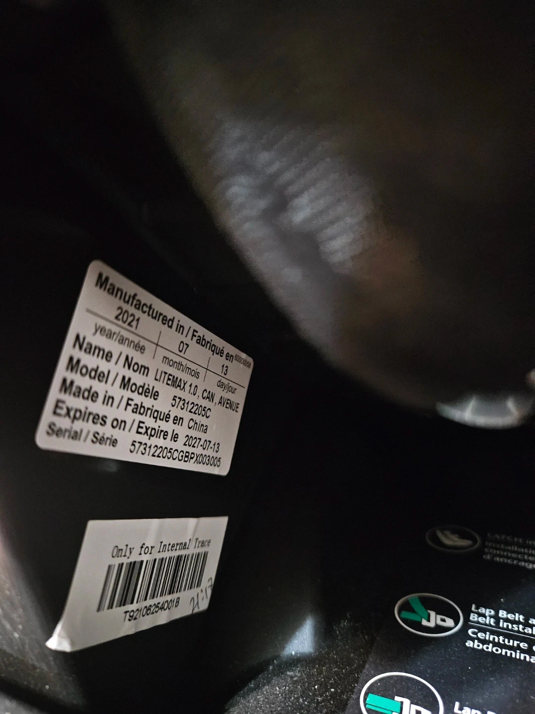 Evenflo Litemax 1.0 car seat. Manufactured in 2021, expires 2027-07-13. Suitable for children 1.8-9 kg (4-20 lbs) and 9-15.8 kg (20-35 lbs). Made in China.
