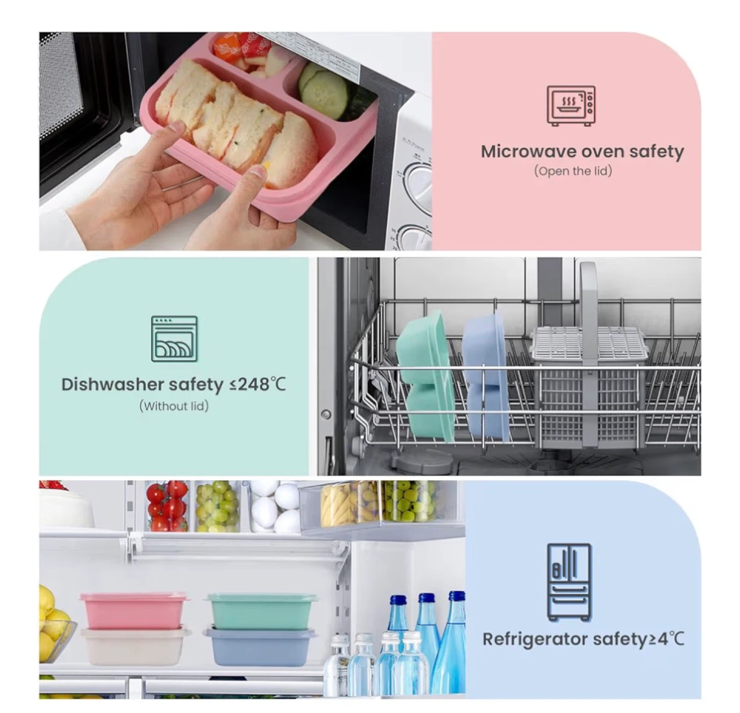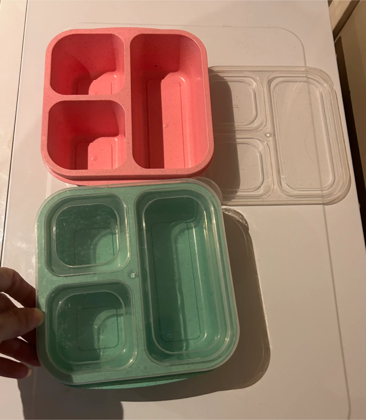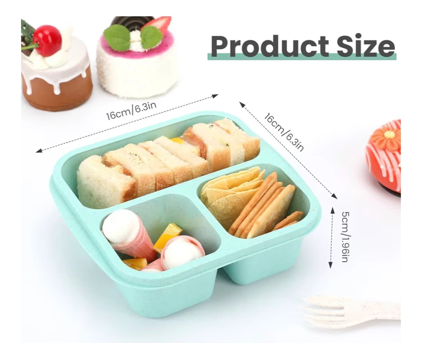 Convenient 3-compartment lunch boxes (2) for packing meals. They're microwave and dishwasher safe (up to 248°C without lid). Suitable for refrigerator storage. These boxes are approximately 16cm x 16cm x 5cm.