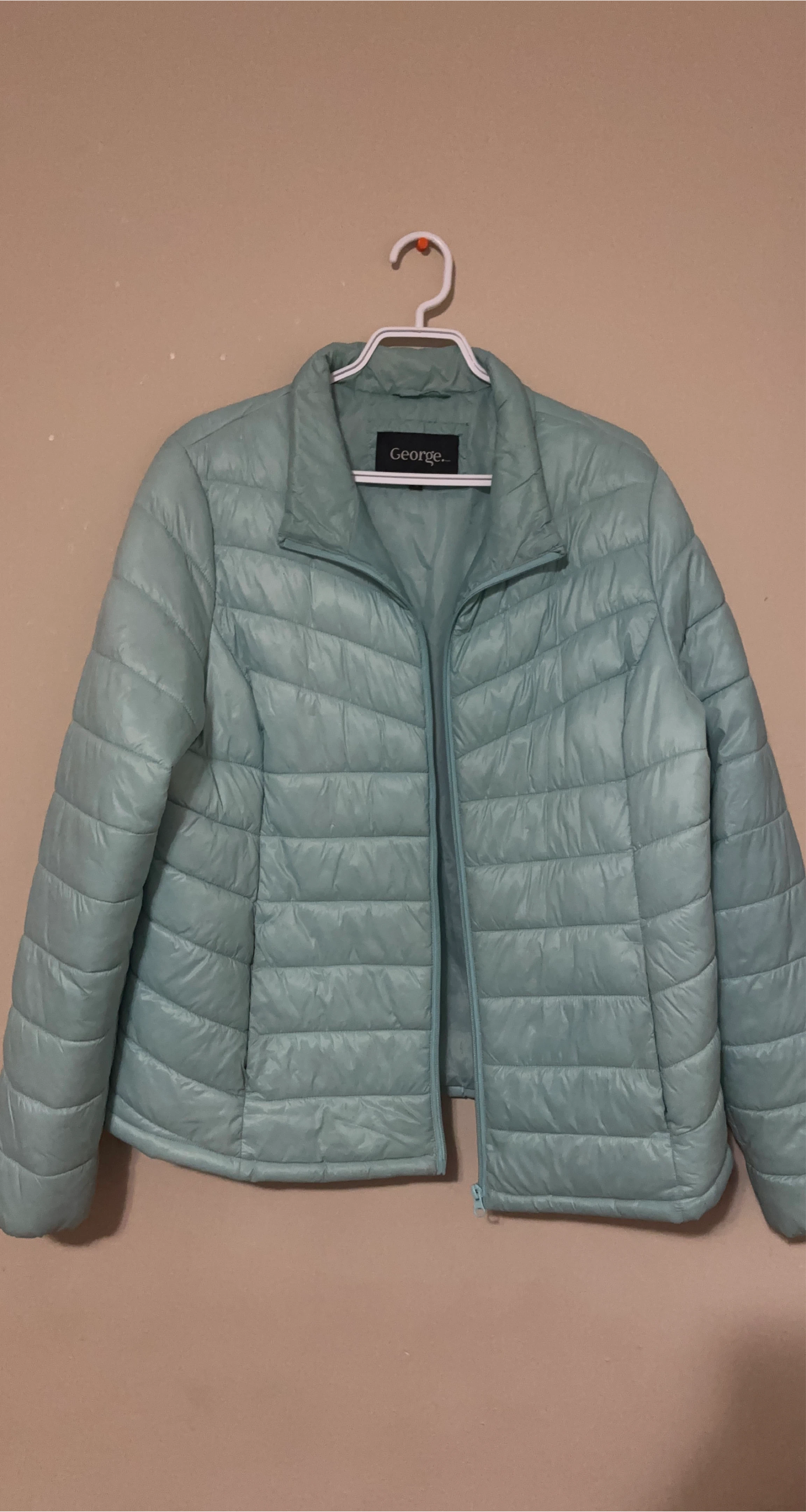 Selling a light blue puffer jacket in size XL. It's in great condition and perfect for layering or wearing on its own during milder weather. This jacket is lightweight and comfortable!