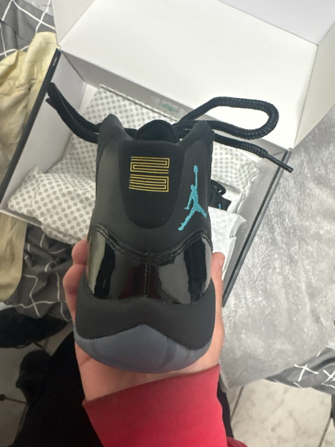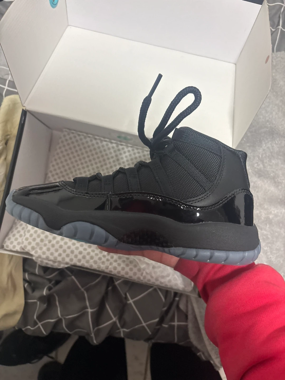 These iconic Air Jordan 11s come in a classic black and white colorway with icy blue accents. They feature a patent leather and textile upper for a sleek look. Includes original box. These sneakers are a must-have for any sneaker enthusiast!